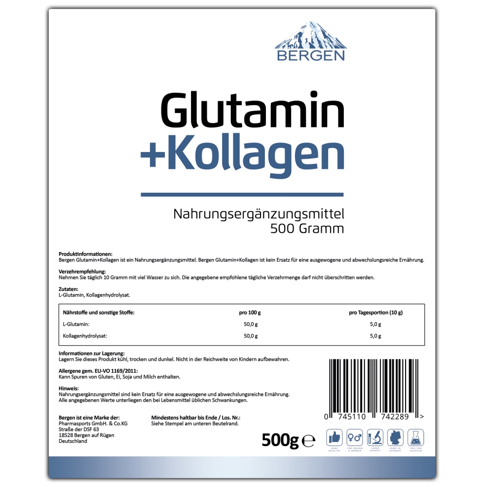 Mit Bergen Glutamin + Kollagen erhalten Sie ein in Deutschland hergestelltes Nahrungsergänzungsmittel , dass Sie ganz ohne Zusätze wie Farbstoffe oder Trennmittel in 100% reiner Form unterstützt. Bergen Glutamin + Kollagen - wiederverschließbaren, lichtundurchlässigen Standbeutel mit einem Inhalt von 500g. Bergen Glutamin + Kollagen Hydrolysat Peptide (5 verschiedene Kollagentypen) ohne Zusätze wie Farb- oder Geschmacksstoffe Das Produkt ist Ihre Quelle für hochwertiges L-Glutamin und Kollagen Hydrolysat Peptide in 100% reiner Pulverform (Collagen Typ 1, 2, 3, 5, 10 - 19 Aminosäuren).