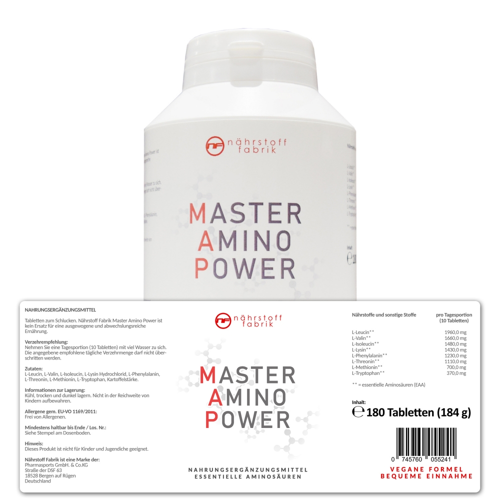 Nährstoff Fabrik Master Amino Power - Standdose á 180 Tabletten. Normale Aminosäuren waren gestern - ab heute setzt man auf EAA's (essentielle Aminosäuren). Master Amino Power aus der Nährstoff Fabrik überzeugt mit allen 8 essentiellen Aminosäuren in der freien und krsitallinen Form - verpackt in eine leicht einzunehmende Tablette.