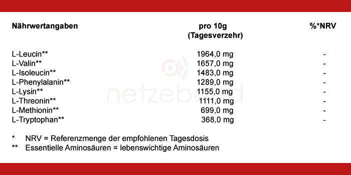 Netzeband 8EA Amino Pattern Pulver liefert die 8 essentiellen Aminosäuren im idealen Verhältnis: L-Leucine (19,6%), L-Valin (16,6%), L-Isoleucin (14,8%), L-Lysin Hydrochlorid (14,3%), L-Phenylalanin (12,9%), L-Threonin (11,1%), L-Methionine (7,0%), L-Tryptophan (3,7%)