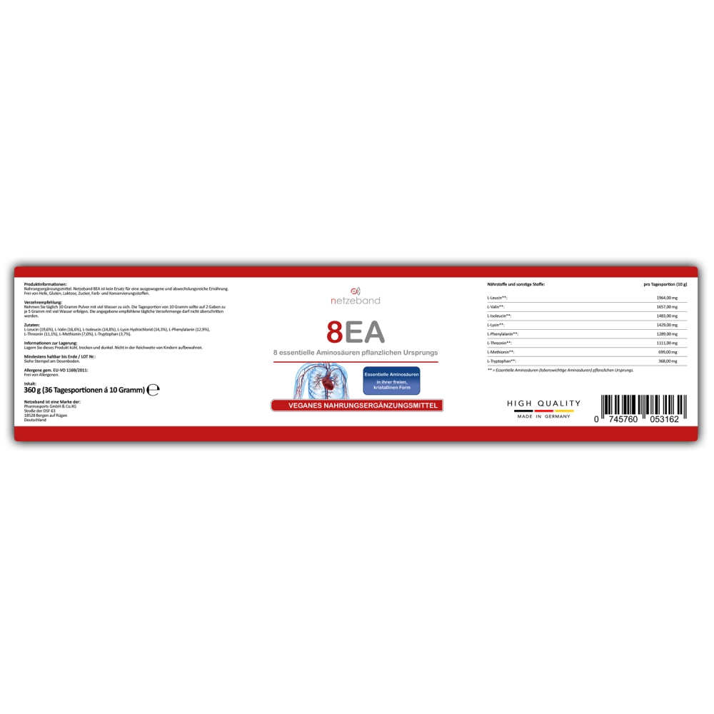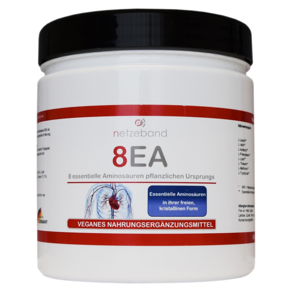 Netzeband 8EA - Amino Pattern Pulver Dose á 360 Gramm. Netzeband 8EA ist ein hochwertiges Nahrungsergänzungsmittel, welches Sie mit den 8 lebenswichtigen (essentiellen) Aminosäuren unterstützt. Pro Dose sind 360 Gramm enthalten, welche zugleich 36 Tagesportionen á 10 entsprechen (2 Einzelportionen täglich á 5 Gramm). Die enthaltenen essentiellen Aminosäuren sind pflanzlichen Ursprungs, so dass die Einnahme dieser hochwertigen Nahrungsergänzung auch für Veganer und Vegetarier geeignet ist. Netzeband 8EA ist frei von Geschmacks- und Farbstoffen. Geliefert wird Amino Pattern Pulver 8EA in einer lichtundurchlässigen, wiederverschließbaren Standdose.