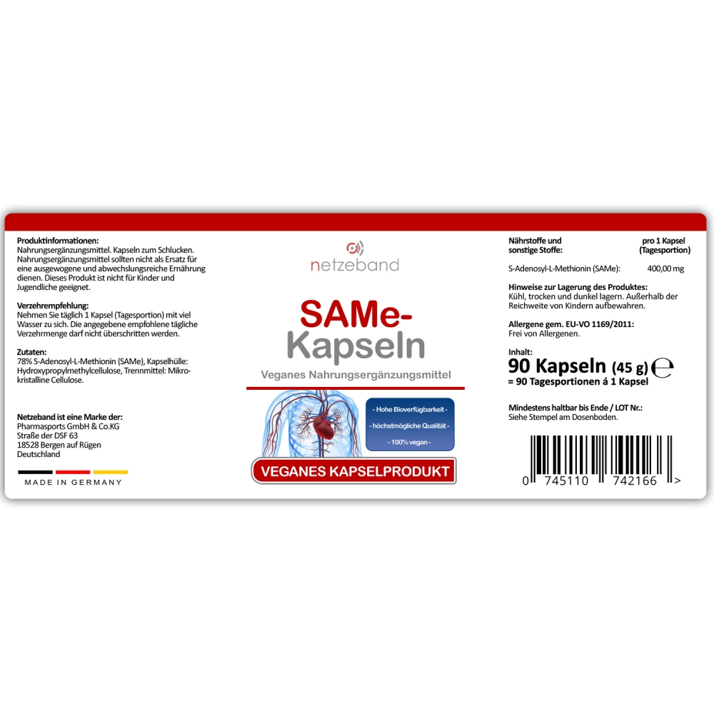 Netzeband ist ein bekannter Hersteller von Nahrungsergänzungsmitteln und Gesundheitsprodukten. SAMe (S-Adenosylmethionin S-Adenosyl-L-Methionin ) ist eine natürliche Substanz, die vom Körper produziert wird und wichtige Funktionen in Zellen erfüllt. SAMe kann als Ergänzung zur Unterstützung der Stimmung und der Gesundheit der Gelenke verwendet werden. Es kann sich auch positiv auf die Leberfunktion auswirken. Diese Form des Produkts enthält 400 mg reines SAMe und wird in Form von 90 Kapseln geliefert.