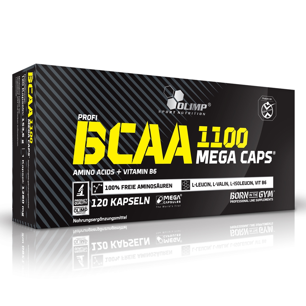 Olimp BCAA 1100 - Packung á 120 Kapseln. Olimp BCAA 1100 enthalten, wie es der Name schon verrät, die bekannten BCAAs (branched chain amino acids). Diese enthalten die 3 Aminosäuren L-Leucin, L-Valin, sowie L-Isoleucin. Olimp BCAA 1100 überzeugt mit 3300 Milligramm BCAAs pro 3 Kapseln.