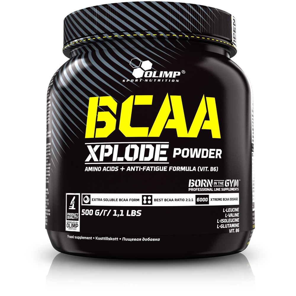 Olimp BCAA Xplode - Dose á 500 Gramm. Wie es der Name dieser hochwertigen Sportnahrung ja bereits schon sagt, versorgt Sie Olimp BCAA Xplode Powder mit BCAA's (branched chain amino acids = verzweigtkettige Aminosäuren), der Aminosäure L-Glutamin und dem Vitamin - Vitamin B6.