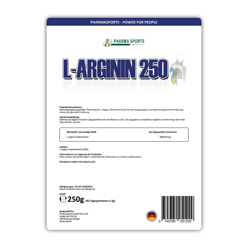 Pharmasports Arginin 250 - wiederverschließbarer Standbeutel á 250 Gramm. Pharmasports bietet Ihnen mit Arginin 250 ein reines Arginin HCL (Arginin Hydrochlorid) ganz ohne Zusätze wie Farb- oder Geschmacksstoffe. Pro Packung sind 250 Gramm enthalten, die etwa 83 Einzelportionen á 3 Gramm entsprechen. Bis heute finden sich Anwender aus den verschiedensten Bereichen, die L-Arginin zur täglichen Versorgung nutzen. Bei Pharmasports L-Arginin 250 handelt es sich um ein deutsches Markenprodukt, welches in Deutschland hergestellt wird. Pharmasports bietet Ihnen L-Arginin 250 in einem wiederverschließbaren Standbeutel.