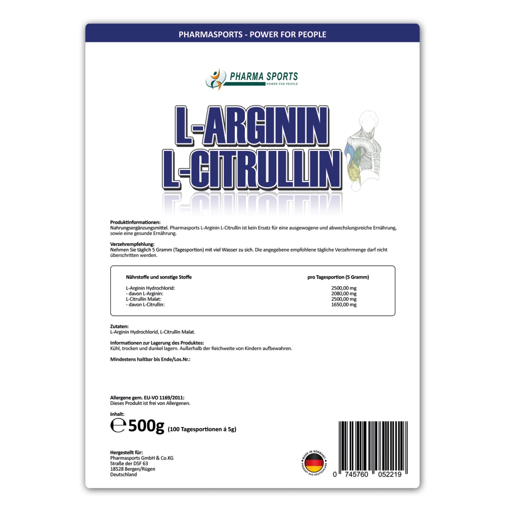 Pharmasports L-Arginin L-Citrullin Pulver - Standbeutel á 500 Gramm. Pharmasports L-Arginin L-Citrullin ist Quelle für die beiden wertvollen Aminosäuren L-Arginin, sowie L-Citrullin. Pro Standbeutel sind 500 Gramm enthalten, welche 100 Tagesportionen á 5 Gramm entsprechen. Pharmasports L-Arginin L-Citrullin ist frei von Farb- und Geschmacksstoffen, um den Kunden ein möglichst reines Produkt zu bieten.