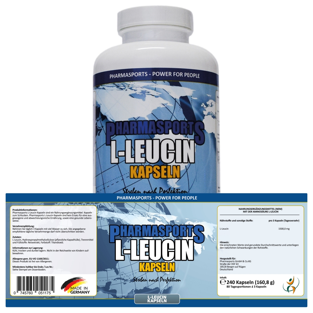 Pharmasports L-Leucin Kapseln - Standdose á 240 Kapseln. Pharmasports L-Leucin Kapseln sind Ihre Quelle für wertvolles L-Leucin in der einfachen und bequemen Kapselform. Pro Kapsel findet sich in dieser hochwertigen Nahrungsergänzung 500 Milligramm reines L-Leucin. Pro Dose sind 240 Kapseln enthalten, die zugleich 80 Tagesportionen á 3 Kapseln entsprechen. Die Einnahme von Pharmasports L-Leucin Kapseln erfolgt täglich mit ausreichend Flüssigkeit wie Wasser oder Fruchtsaft.
