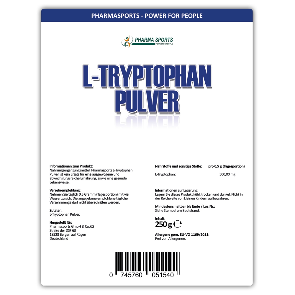 Pharmasports L-Tryptophan Pulver - Standbeutel á 250 Gramm. Pharmasports L-Tryptophan Pulver ist Ihre Quelle für hochwertiges L-Tryptophan Pulver in reiner Qualität, ganz ohne Zusätze wie Farb- oder Geschmacksstoffe. Rein pflanzliche Aminosäure L-Tryptophan, aus Fermentation gewonnen, hohe Bioverfügbarkeit, vegan, glutenfrei, gentechnikfrei, ohne Zusätze. Geliefert wird Pharmasports L-Tryptophan Pulver in einer lichtundurchlässigen, wiederverschließbaren Standbeutel mit einem Inhalt von 250 Gramm. Die Einnahme der täglichen Verzehrmenge von nur 0,5 Gramm erfolgt ganz einfach mit ausreichend Flüssigkeit wie Wasser oder Fruchtsaft.