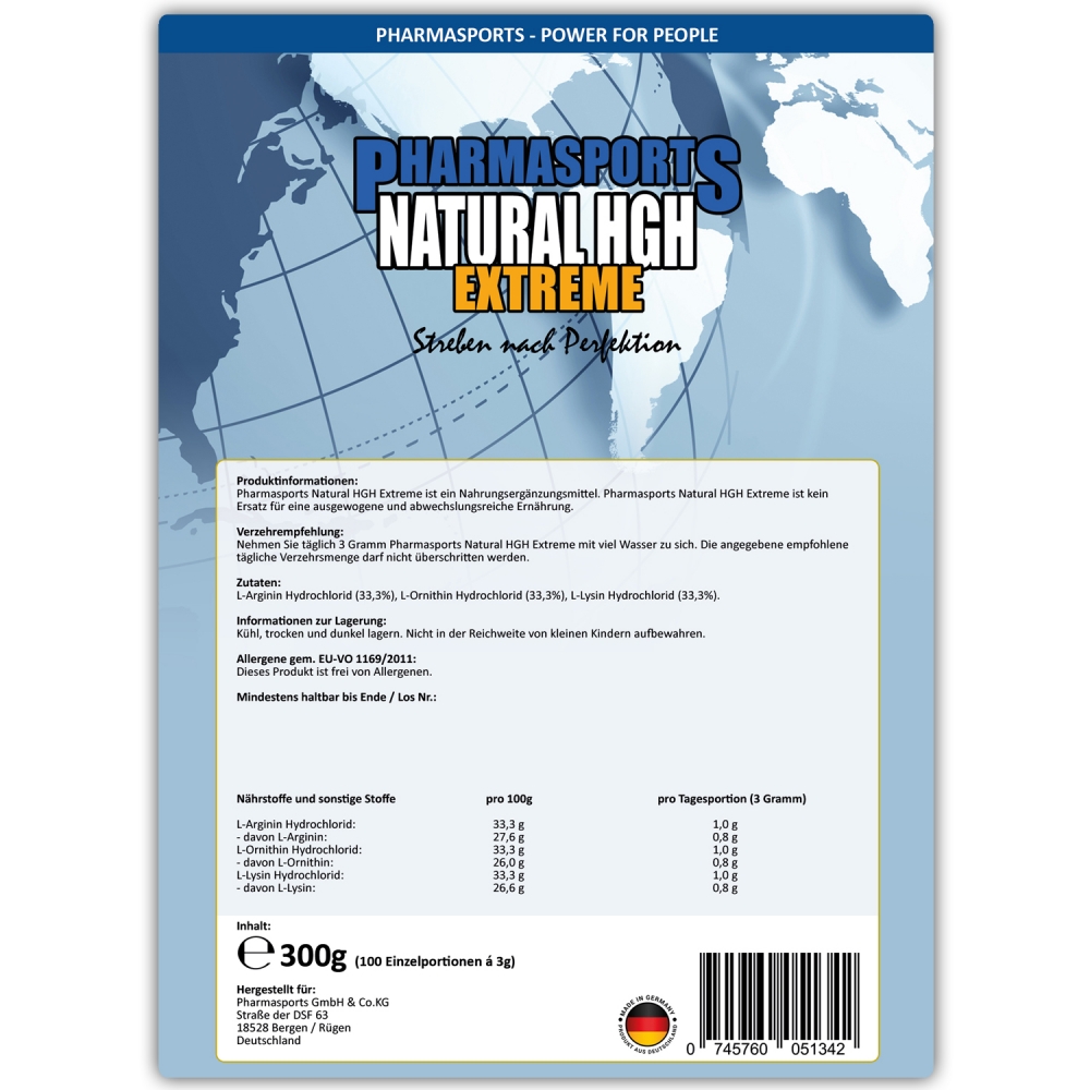 Pharmasports Natural HGH Extreme - Standbeutel á 300 Gramm. Pharmasports Natural HGH Extreme ist eine perfekt abgestimmte Sportnahrung, die Sie direkt mit 3 verschiedenen Aminosäuren (L-Arginin, L-Ornithin und L-Lysin) im perfekten Verhältnis versorgt. Jede enthaltene Aminosäure findet sich zu 33% wieder. Pharmasports Natural HGH Extreme enthält gezielt keine unerwünschten Farb- oder Geschmackstoffe und wird ganz einfach mit Wasser oder Fruchtsaft zubereitet. Pro Standbeutel sind 300 Gramm enthalten, welche 100 Einzelportionen á 3 Gramm entsprechen.
