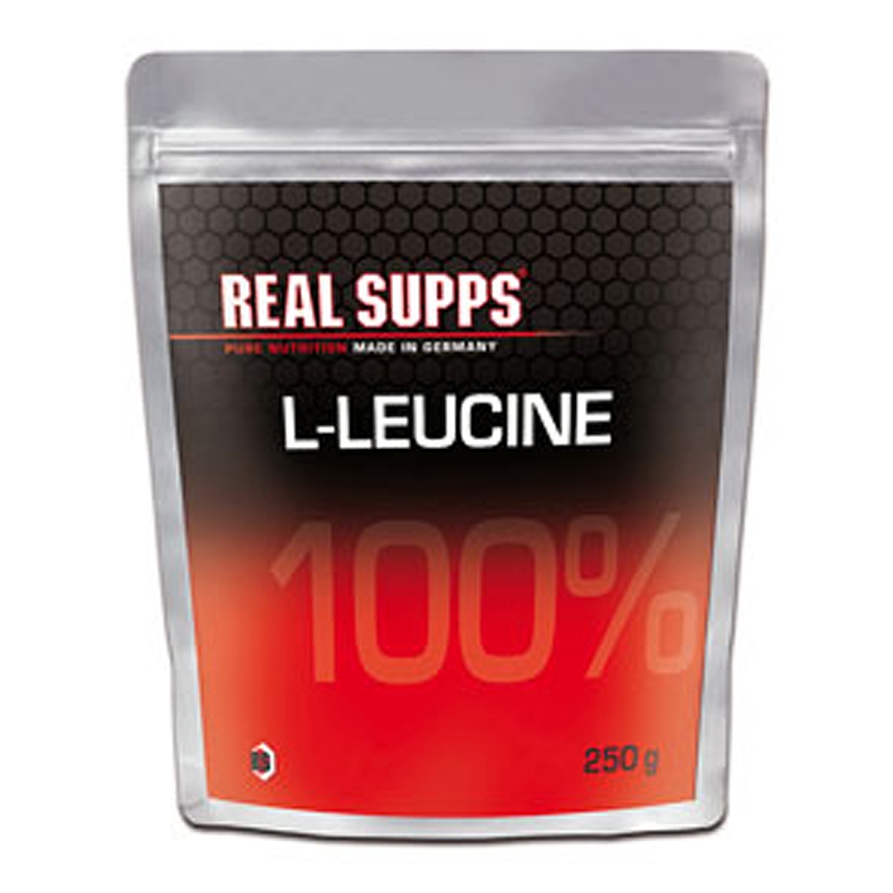 Real Supps 100% L-Leucine - Standbeutel á 250 Gramm.  Real Supps 100% L-Leucine bietet Ihnen 250 Gramm reines L-Leucin, ohne unnötige Geschmacks- oder Farbstoffe. Die Aminosäure L-Leucin gehört zu den proteinogenen Aminosäuren und ist vielen Athleten und Sportlern aus den bekannten BCAA's (branched chain amino acids = verzweigtkettige Aminosäuren) ein Begriff. Die tägliche Portionsgröße von nur 5 Gramm, wird ganz einfach in etwas Wasser oder Fruchtsaft aufgelöst.
