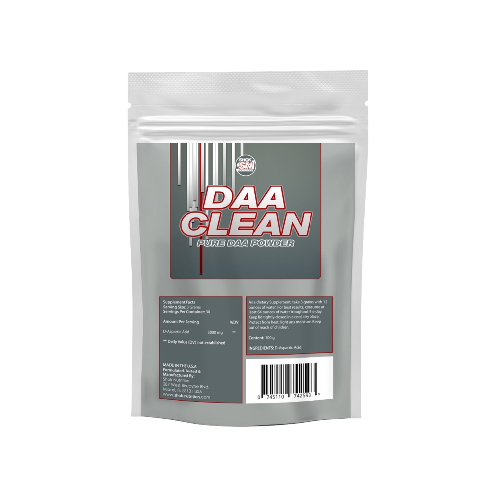 Shok Nutrition DAA-Clean - Standbeutel á 100 Gramm. Shok Nutrition DAA-Clean versorgt Sie mit der beliebten Aminosäure D-Asparaginsäure (englisch: D-Aspartic Acid). Pro Standbeutel sind 100 Gramm enthalten, welche für 33 Einzelportionen genutzt werden können. Die tägliche Portion von 3 Gramm wird ganz einfach mit ausreichend Flüssigkeit wie Wasser oder Fruchtsaft zu sich genommen.