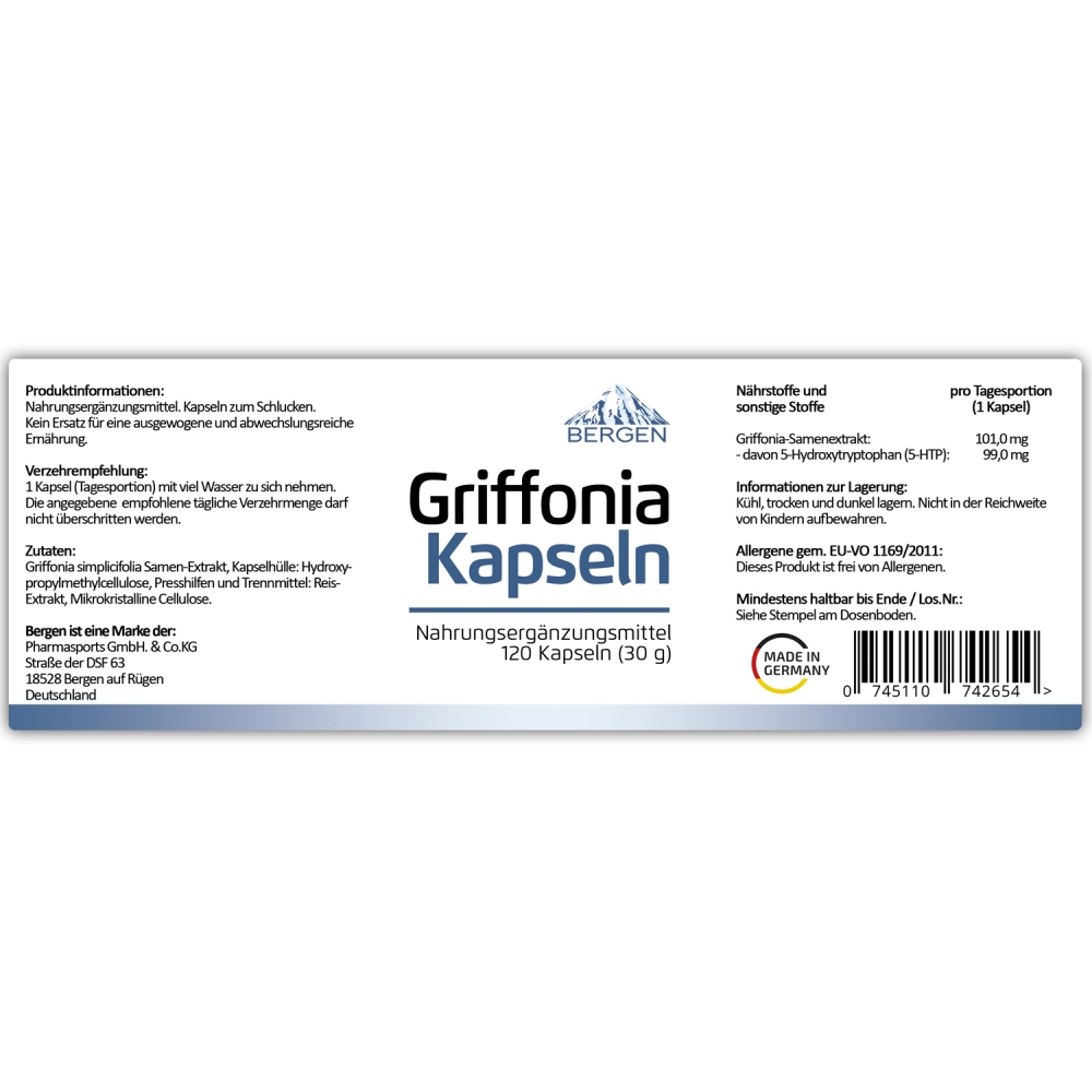 NAHRUNGSERGÄNZUNGSMITTEL AUS DEUTSCHLAND: Mit Bergen Griffonia Kapseln erhalten Sie ein in Deutschland hergestelltes und kontrolliertes Nahrungsergänzungsmittel, dass höchsten Qualitätsstandards entspricht.