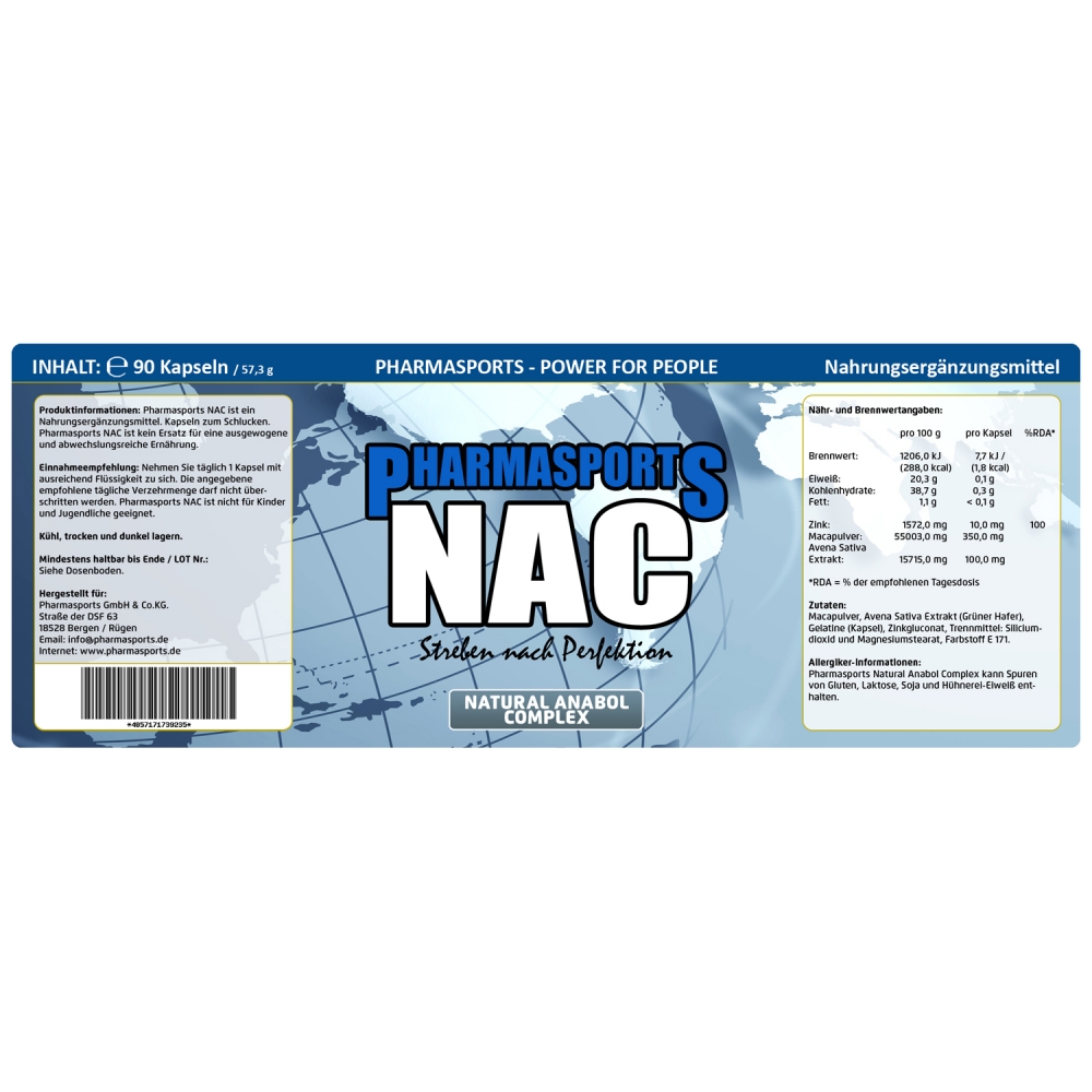 Pharmasports NAC - Dose á 90 Kapseln. Es ist ein absoluter Bestseller und gehört zu den beliebtesten Supplementen überhaupt bei Pharmasports - Pharmasports NAC. Mit Pharmasports NAC erhalten Sie ein perfekt abgestimmtes Nahrungsergänzungsmittel, welches Sie neben Maca und Aven a Sativa Extrakt (Grüner Hafer) noch mit zusätzlichem Zinkgluconat versorgt. Alles natürlich perfekt abgestimmt und in eine bequeme Kapsel verpackt. Durch seinen riesigen Anwendungsbereich wird Pharmasports NAC zum idealen Begleiter in fast jeder Sportart, um den Körper mit hochwertigen Nährstoffen zu versorgen. NAC steht für die Bezeichnung "Natural Anabol Complex".