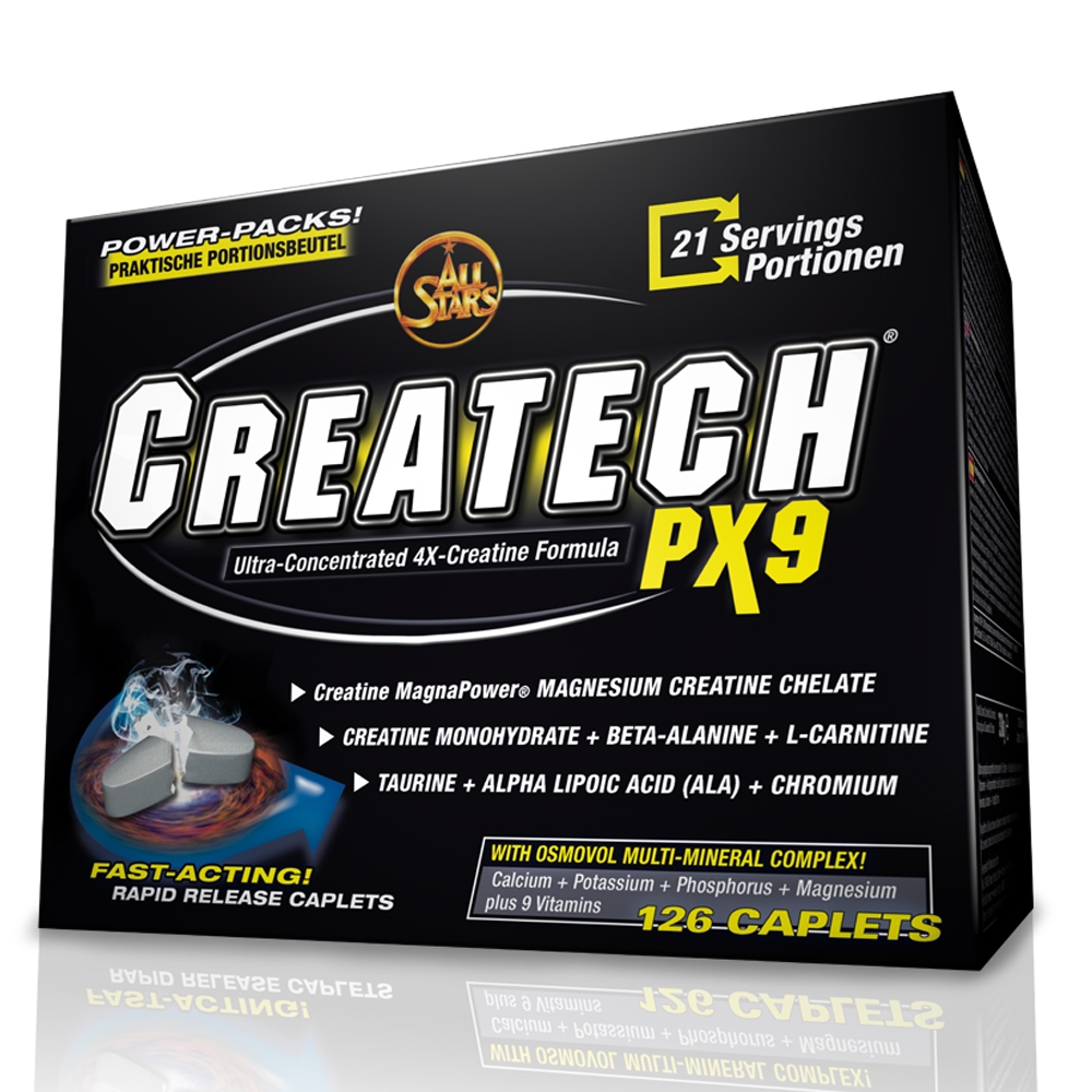 All Stars Crea-Tech PX9 - Packung á 126 Caplets. All Stars Crea-Tech PX9 enthält Creatin Monohydrat, Beta-Alanin und L-Carnitin, sowie Taurin, ALA (Alpha Liponsäure) und Chromium.