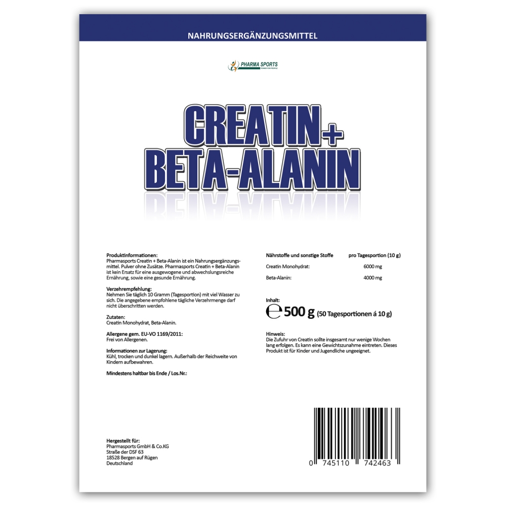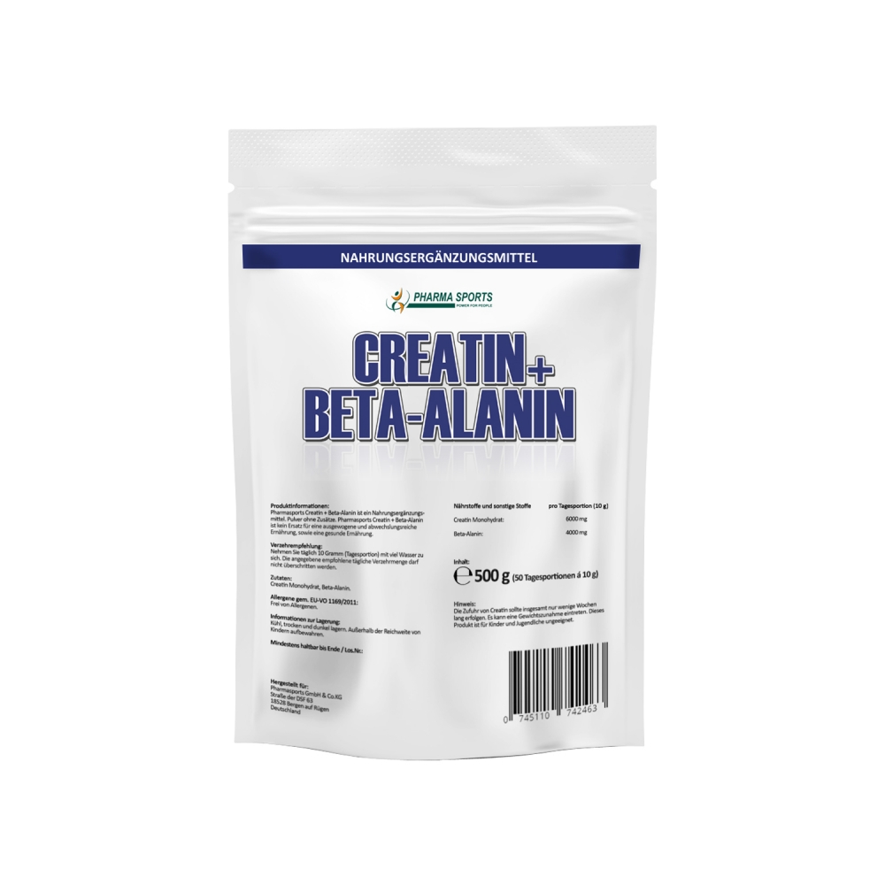 Pharmasports Creatin + Beta-Alanin - Standbeutel á 500 Gramm. Unser CREA-BETA DUO ist ein Nahrungsergänzungsmittel (NEM) aus Deutschland, dass Sie neben dem bekannten Creatin Monohydrat noch mit zusätzlichem Beta-Alanin unterstützt. Bei Pharmasports Creatin + Beta-Alanin handelt es sich um ein veganes Nahrungsergänzungsmittel aus Deutschland. Pro Standbeutel findet sich eine Menge von 500 Gramm, die zugleich 50 Tagesportionen á 10 Gramm entspricht. Geliefert wird Pharmasports Creatin + Beta-Alanin in einem lichtundurchlässigen, wiederverschließbaren Standbeutel, welcher sich für eine optimale Lagerung des Produktes eignet.
