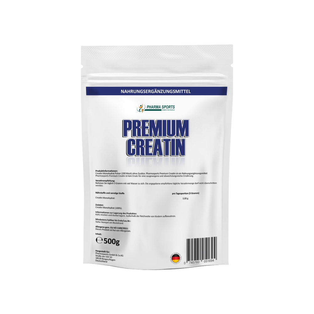 Pharmasports Premium Ultrapure Creatin - Standbeutel á 500 Gramm. Pharmasports Premium Creatin versorgt Sie mit hochwertigem Creatin Monohydrat Pulver, in absoluter Spitzenqualität. Pharmasports Premium Creatin besteht aus einem 100% reinem micronisierten Creatin Monohydrat, mit einem Meshfaktor von 200, was für eine optimale Resorption sorgt. Gezielt wurde bei Pharmasports Premium Creatin auf unnötige Farb- und Geschmacksstoffe verzichtet, um den Athleten ein reines, hochwertiges Produkt in reiner Form zu bieten. Pro Standbeutel sind 500 Gramm enthalten, welche zugleich ca. 166 Einzelportionen á 3 Gramm darstellen.