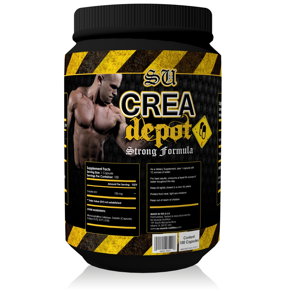 SU-Nutrition Crea Depot - Standbeutel á 100 Kapseln. SU-Nutrition Crea Depot ist ein US-amerikanisches Markenprodukt, welches Sie mit hochwertigem Creatin HCL (Creatin Hydrochlorid) versorgt. Geliefert wird SU-Nutrition Crea Depot in einem wiederverschließbaren Standbeutel mit einem Inhalt von 100 Kapseln, die 100 Einzelportionen á 1 Kapsel entsprechen.