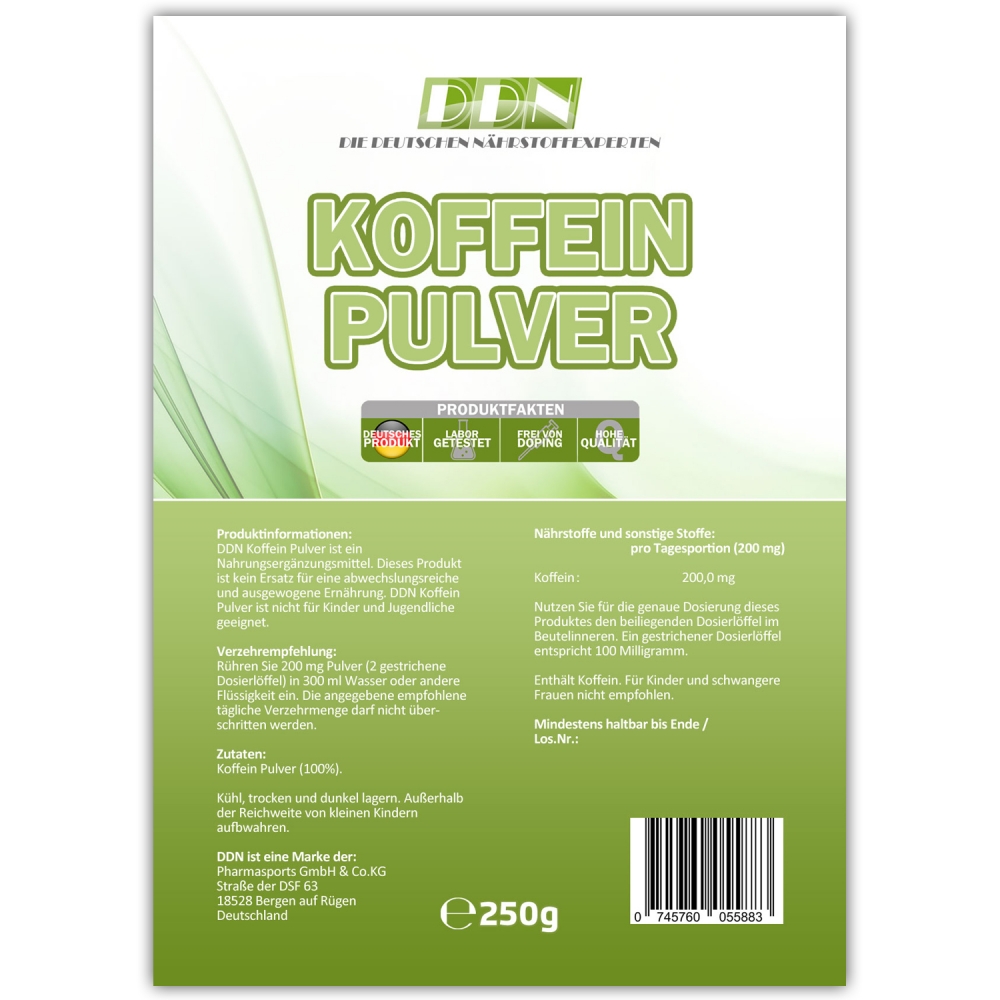 DDN Koffein Pulver - Standbeutel á 250 Gramm. Koffein ist den meisten Athleten wohl aus den bekannten Energy Drinks ein Begriff. Aber auch in anderen Getränken, wie zum Beispiel Cola, Kaffee oder einigen Teesorten ist Koffein enthalten. DDN Koffein Pulver ist eine deutsches Markenprodukt, welches Sie mit reinem, hochwertigen Koffein in bester Pulverform versorgt.