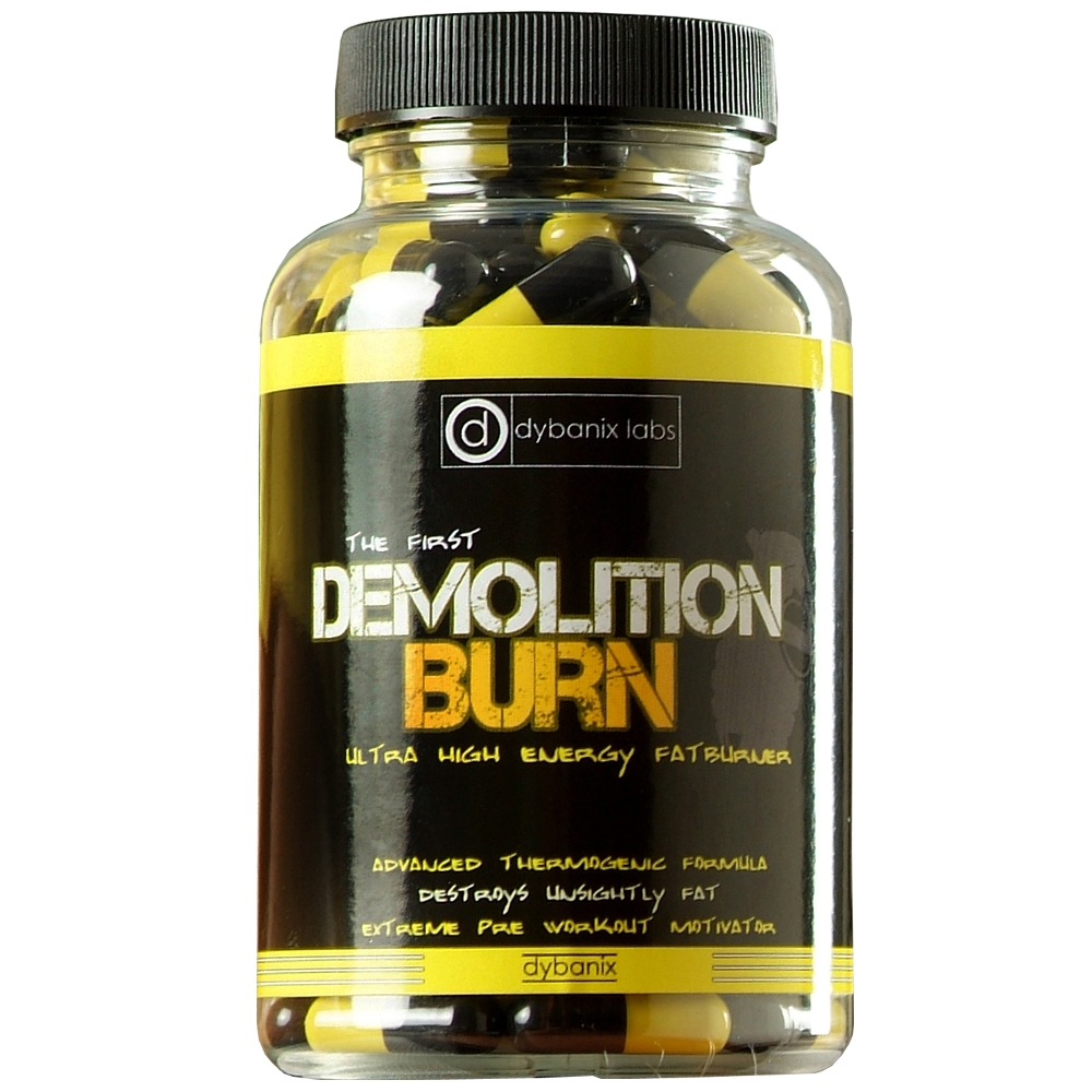 Dybanix Demolition Burn - Dose á 100 Kapseln. Dybanix Demolition Burn ist ein deutsches Markenprodukt. Pro Dose sind 100 Kapseln enthalten, welche zugleich 50 Einzelportionen á 2 Kapsel entsprechen. Unter anderem finden sich in dieser hochwertigen Sportnahrung Zutaten wie zum Beispiel Grüntee Extrakt, Citrus Aurantium Extrakt und Koffein.