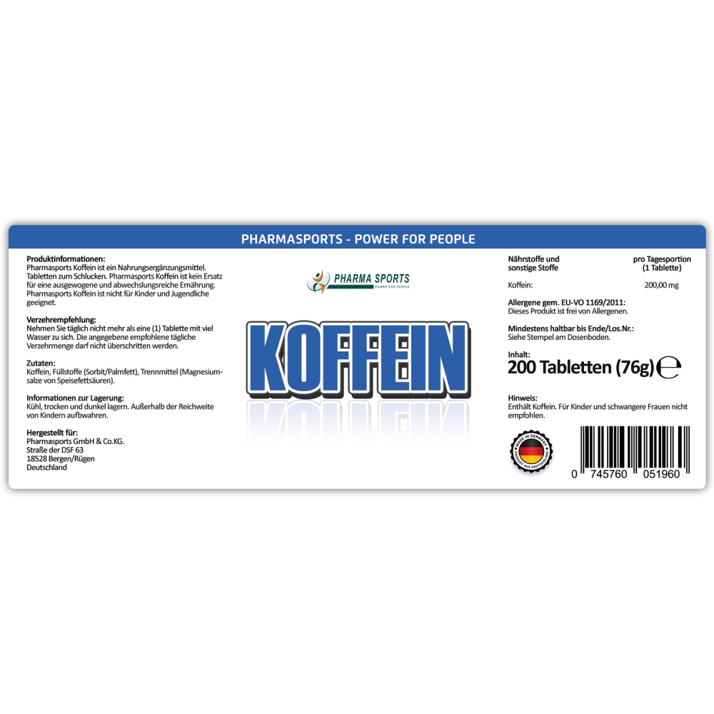 Pharmasports Koffein - Standdose á 200 Tabletten. Pharmasports Koffein ist Ihre Quelle für Koffein in der einfachen und bequemen Tablettenform. Pro Tablette finden sich in Pharmasports Koffein 200 Milligramm reines Koffein. Durch die bequeme Tablettenvariante wird nicht nur die Einnahme vereinfacht, sondern zudem auch eine genaue Tagesdosierung ermöglicht. Geliefert wird Pharmasports Koffein in einer wiederverschließbaren Standdose mit einem Inhalt von 200 Tabletten, welche zugleich auch 200 Tagesportionen á 1 Tablette darstellen.