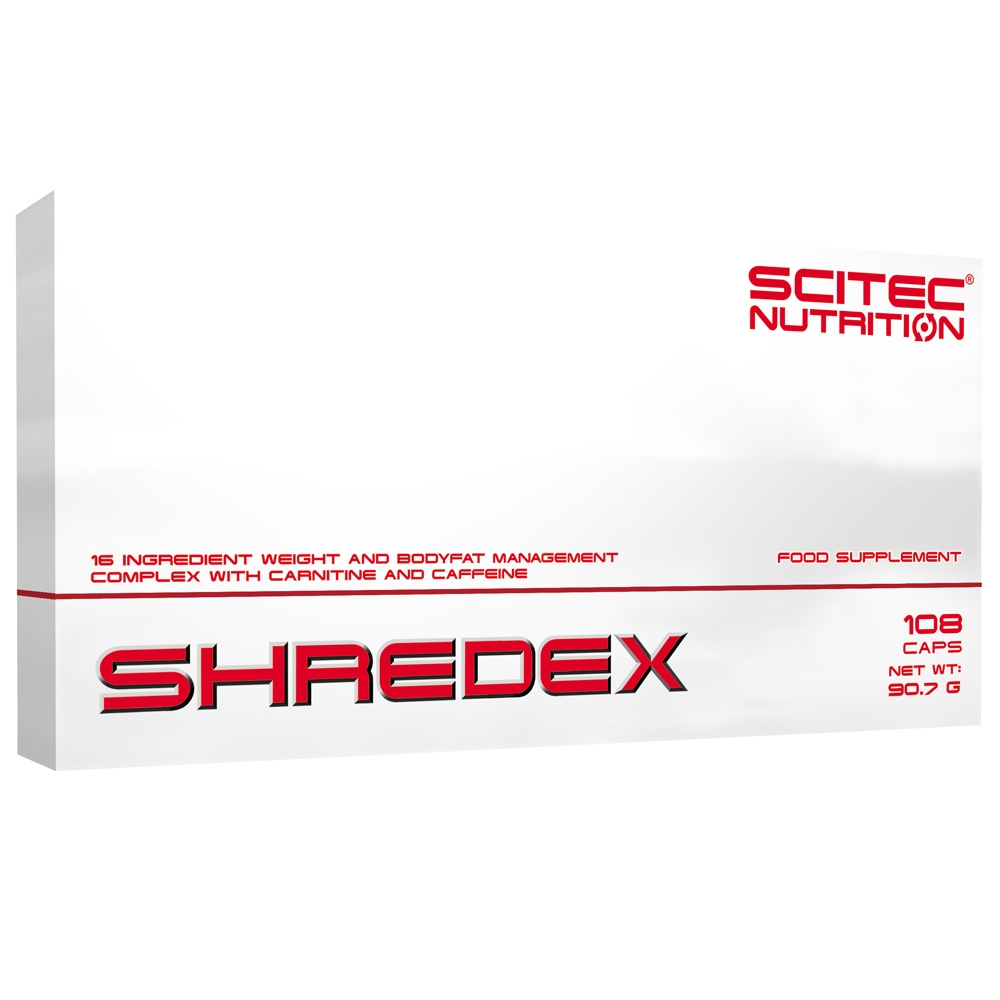 Scitec Nutrition Shredex - Packung á 108 Kapseln. Scitec Nutrition Shredex ist ein hochwertiges Kapselprodukt, welches vor sportlicher Akitivität zum Einsatz, um den Körper mit wertvollen Nährstoffen zu versorgen. Neben Zutaten wie L-Carnitin Tartrat, L-Phenylalanin und L-Tyrosin, finden sich noch weitere Zutaten wie Koffein, Garcinia Cambogia oder Grüntee-Extrakt.