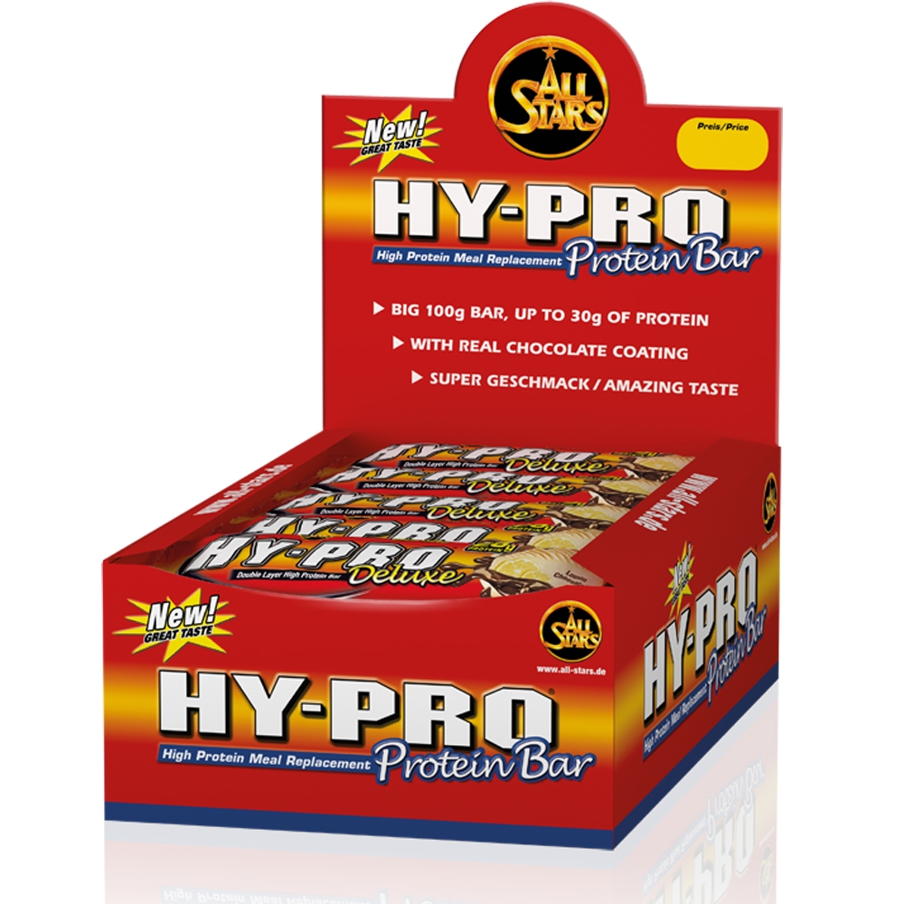 100% purer Riegel-Genuss aus dem Hause All-Stars! Eiweissanteil bis zu 31%, natürlich als kleine Mahlzeit vor, nach oder zwischen den Sporteinheiten oder auch einfach als leckeren Riegel für den ganz normalen Verzehr! Der All-Stars Hy-Pro 100gramm Protein Riegel versorgt den Körper mit schnell resorbierbaren Kohlenhydraten und einem hohen Anteil an hochwertigen Milcheiweiss! Der All-Stars Hy-Pro Riegel kommt in der leckeren Geschmackssorte Erdbeer-Yoghurt! All-Stars Hy-Pro Deluxe liefert Proteine und somit wichtige Aminosäuren für Ihren Muskelaufbau, liefern Energie und Kraft aus wertvollen Kohlenhydraten.