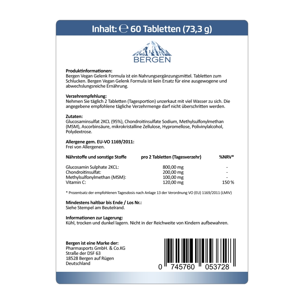 Bergen Vegan Gelenk Formula - Standbeutel á 60 Tabletten. Bergen Vegan Gelenk Formula ist ein Nahrungsergänzungsmittel, welches Sie mit Glucosamin pflanzlich Chondroitin pflanzlich, Methylsulfonylmethan (MSM) pflanzlich, sowie Vitamin C versorgt. Für eine einfache Einnahme und eine genaue Dosierung wurde bei diesem Produkt auf die bequeme Tablettenvariante gesetzt. Pro Packung sind 60 Tabletten enthalten, die 30 Tagesportionen á 2 Tabletten entsprechen. Bei Bergen Vegan Gelenk Formula handelt es sich um ein Nahrungsergänzungsmittel ist vollständig pflanzlich.dass von Anwendern genutzt werden kann, die sich vegetarisch oder vegan ernähren.