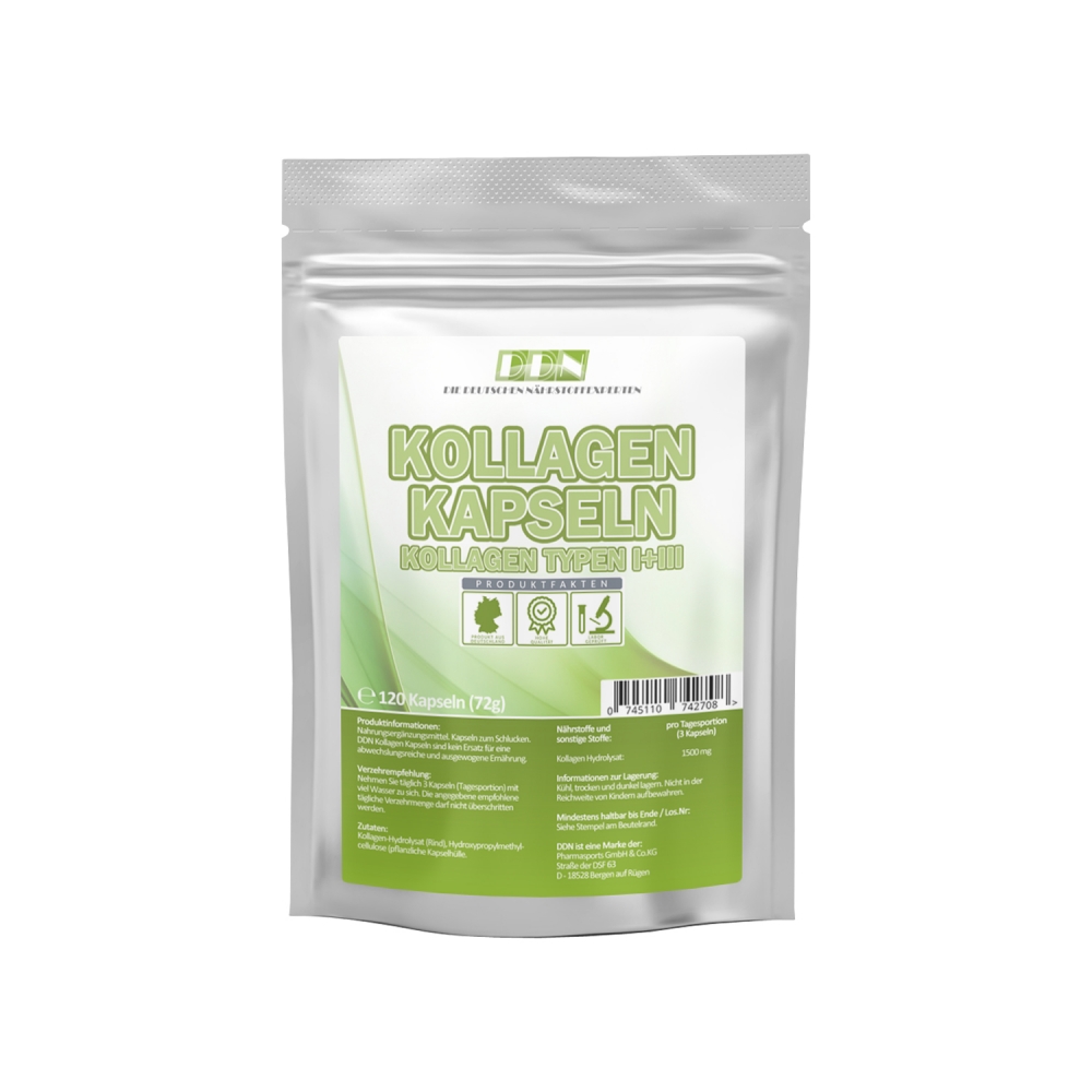 DDN Kollagen Kapseln - wiederverschließbarer Standbeutel á 120 Kapseln. DDN Kollagen Kapseln liefert Ihnen pro Tagesportion (3 Kapseln) eine Menge von 1,5 Gramm hochwertiges Rinderkollagen Hydrolysat der Typen I-III. Kollagen gehört im Bereich der Nahrungsergänzungsmittel zu den beliebtesten Nährstoffen, um die Haut zu unterstützen.