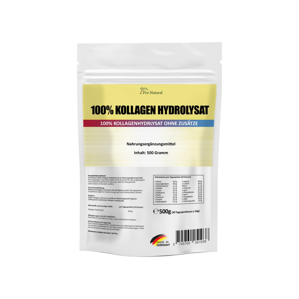 Pro Natural 100% Kollagen Hydrolysat - Standbeutel á 500 Gramm. Pro Natural 100% Kollagen Hydrolysat ist Ihre Quelle für hochwertiges Kollagen Hydrolysat in 100% reiner Pulverform. Gezielt wurde bei diesem Produkt auf Zusätze wie Farb- oder Geschmacksstoffe verzichtet, um den Anwender ein absolut reines Pulverprodukt bieten zu können. Pro Standbeutel sind 500 Gramm Pulver enthalten, welche zugleich 50 Tagesportionen á 10 Gramm entsprechen.