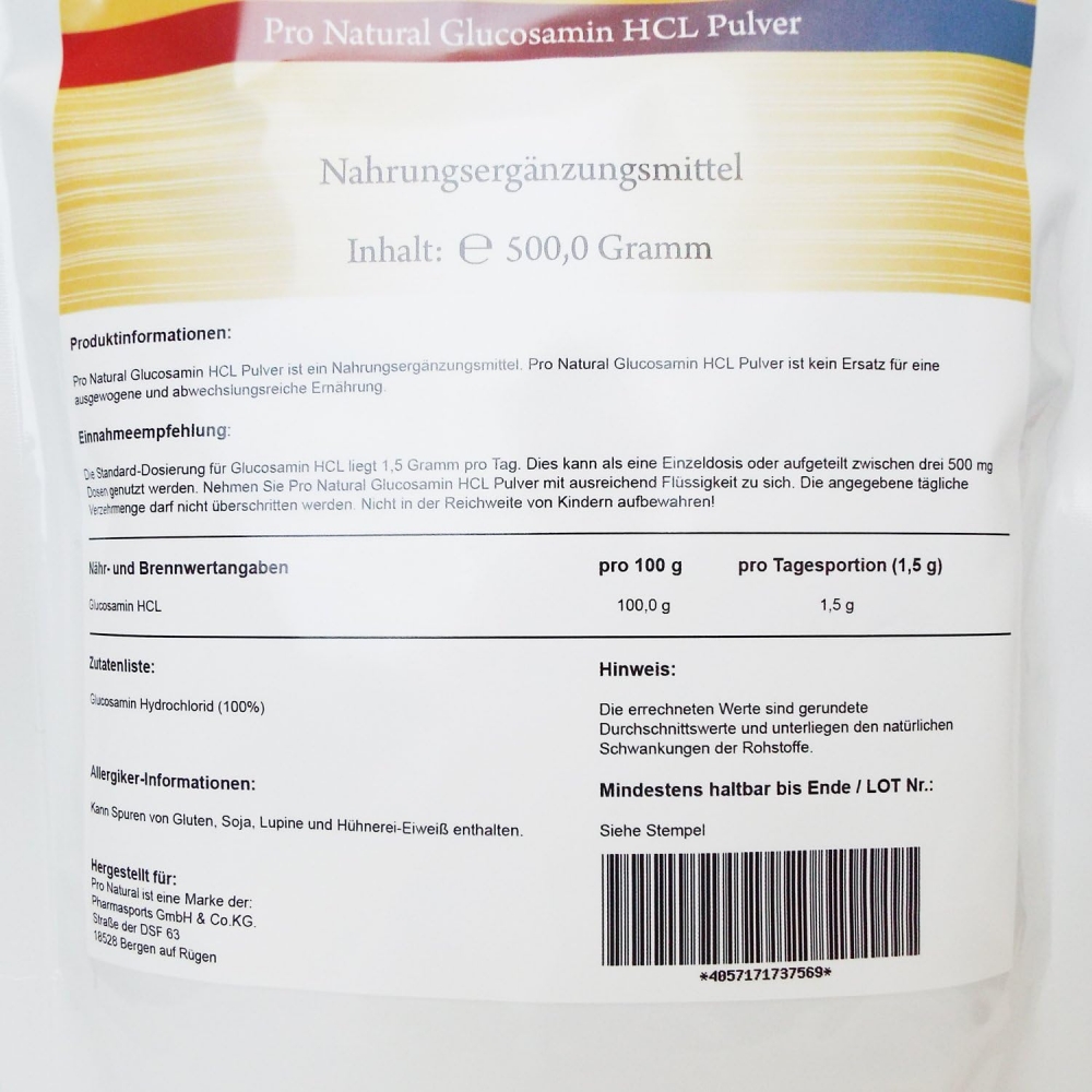 Pro Natural Glucosamin HCL Pulver - Standbeutel á 500 Gramm. Es gehört zu den beliebtesten Nahrungsergänzungen überhaupt - Glucosamine. Bei Glucosamin handelt es sich genau gesagt um einen Aminozucker, welcher auch im menschlichen Körper natürlich vorkommt. Glucosamin ist ein Bestandteil des Knorpels, des Bindegewebes, sowie auch der Gelenkflüssigkeit. Bei Glucosamin handelt es sich um einen wichtigen Baustein unseres Körpers. Pharmasports bietet Ihnen mit Pro Natural Glucosamine HCL (Glucosamin Hydrochlorid) ein Pulverprodukt, ganz ohne Farb- oder unbrauchbare Geschmacksstoffe in einem hohen Qualitätsstandard.