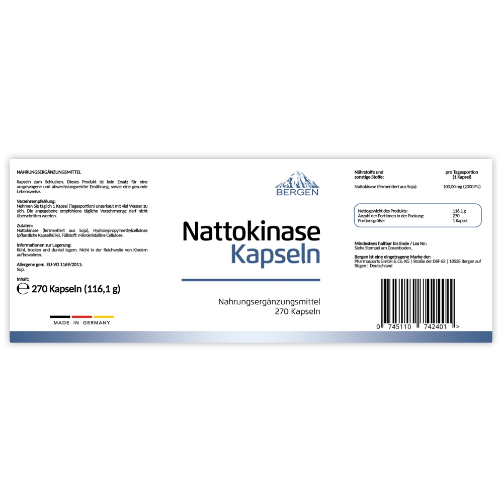 Bergen Nattokinase Kapseln - wiederverschließbare Standdose á 270 Kapseln. Mit Bergen Nattokinase Kapseln erhalten Sie ein in Deutschland hergestelltes veganes Nahrungsergänzungsmittel, dass Sie mit 100 Milligramm Nattokinase (aus Soja fermentiert) unterstützt. Geliefert werden Bergen Nattokinase Kapseln in einer lichtundurchlässigen, wiederverschließbaren Verpackung, die sich für eine optimale Lagerung des Produktes eignet. Zudem sind Bergen Nattokinase Kapseln frei von unterwünschten Zusatzstoffen wie Farb- oder Geschmacksstoffen.
