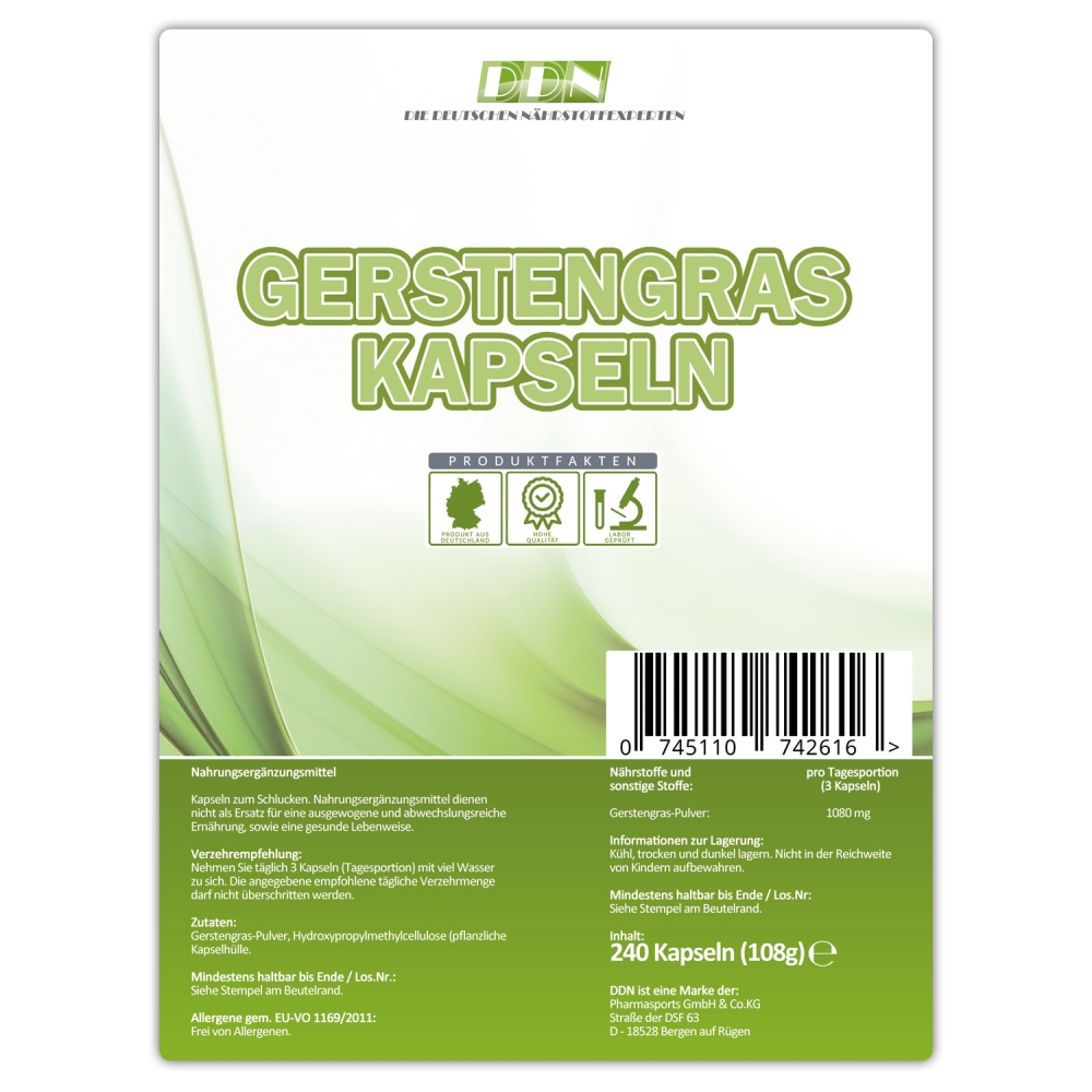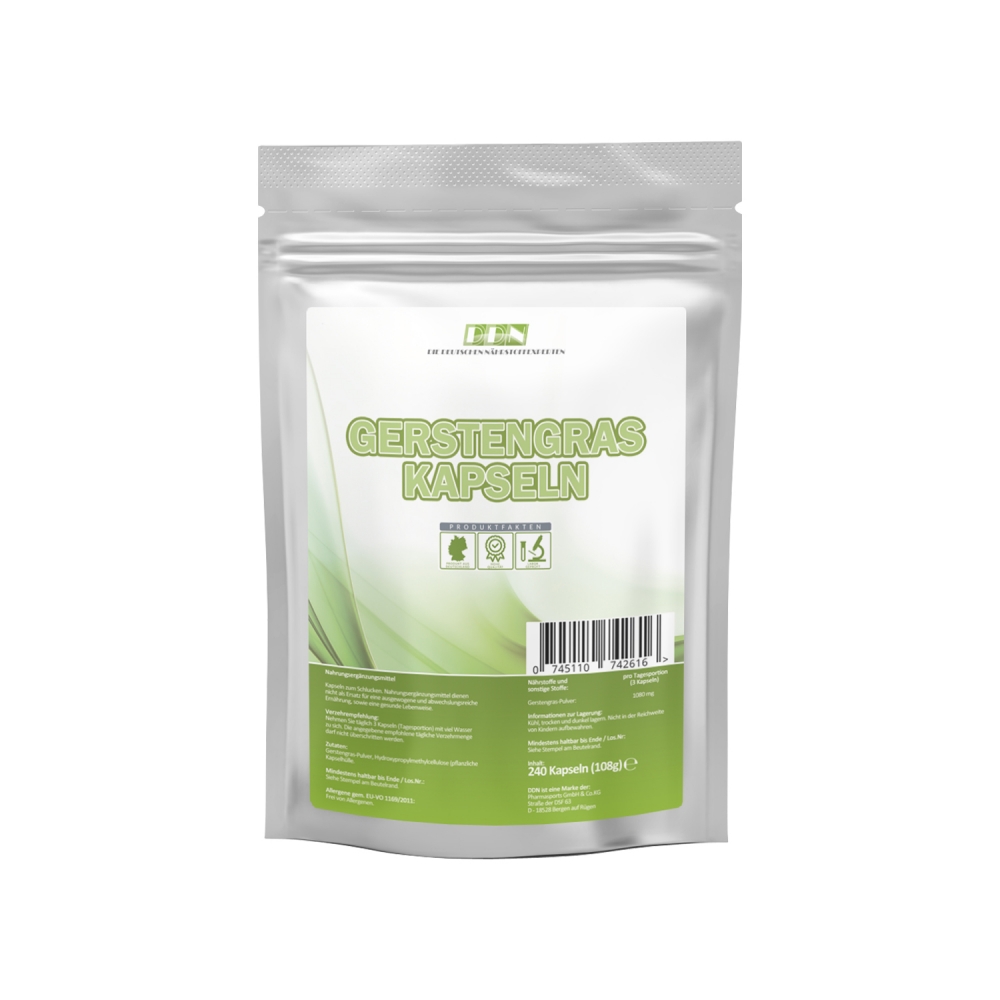 DDN Gerstengras Kapseln - wiederverschließbarer Standbeutel á 240 Kapseln. DDN Gerstengras Kapseln liefert Ihnen pro Tagesportion (3 Kapseln) eine Menge von 1080 Milligramm hochwertiges Gerstengras-Pulver. Gerstengras wird aufgrund verschiedenster Eigenschaften oftmals als Superfood bezeichnet.