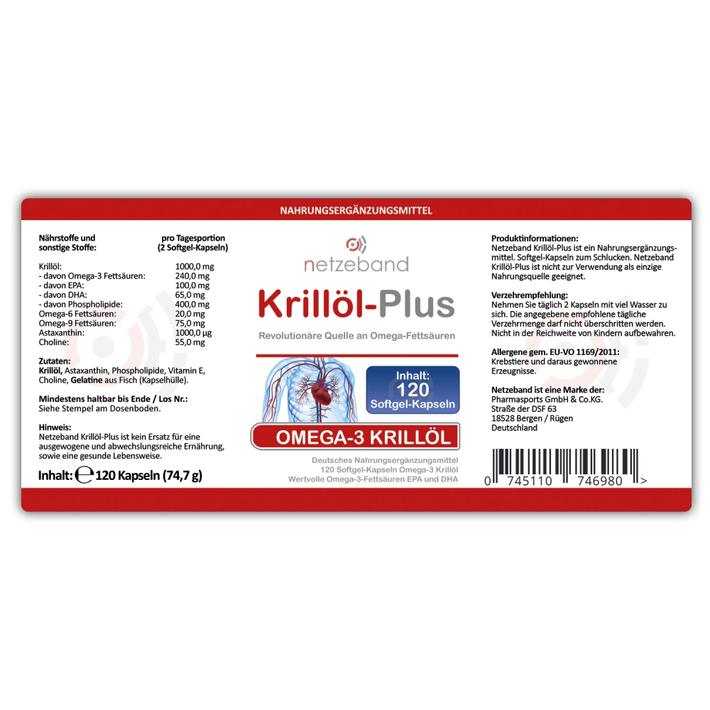 Netzeband Krillöl-Plus - Dose á 120 Kapseln. Mit Netzeband Krillöl-Plus erhalten Sie ein deutsches Markenprodukt, welches Sie neben wertvollen Omega-3, Omega-6, Omega-9, sowie mit Astaxanthin, Phospholipide, Vitamin E und Choline unterstützt. Pro Dose sind 120 Kapseln enthalten, welches zugleich 60 Einzelportionen á 2 Softgel-Kapseln entsprechen.