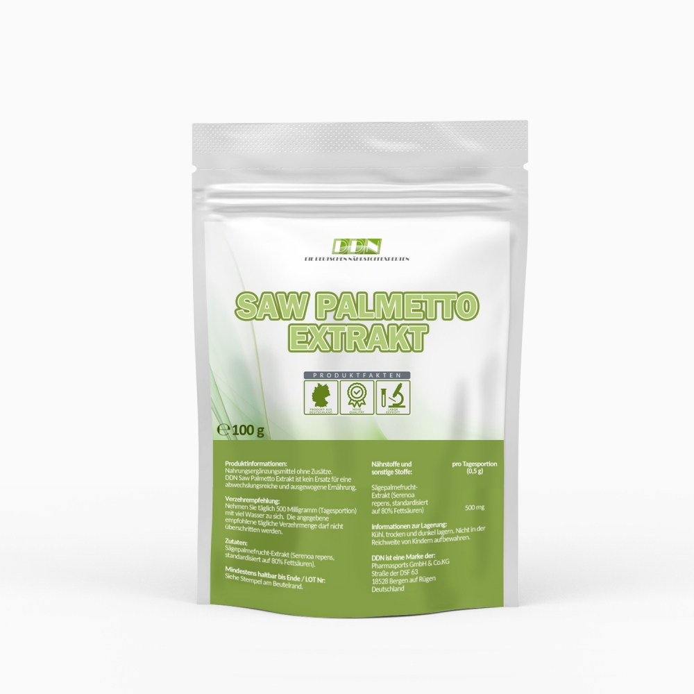 DDN Saw Palmetto Extrakt - wiederverschließbarer Standbeutel mit einem Inhalt von 100 Gramm. Wer auf der Suche nach einem reinem Sägepalmefrucht-Extrakt ist, ist bei DDN an genau der richtigen Adresse. Mit DDN Saw Palmetto Extrakt erhalten Sie ein 100% reines, veganes, zusatzfreies Pulver, dass auf 80% Fettsäuren standartisiert wurde.Sägepalmenfruchtextrakt 80% (0,5g haben 400mg Fettsäuren).