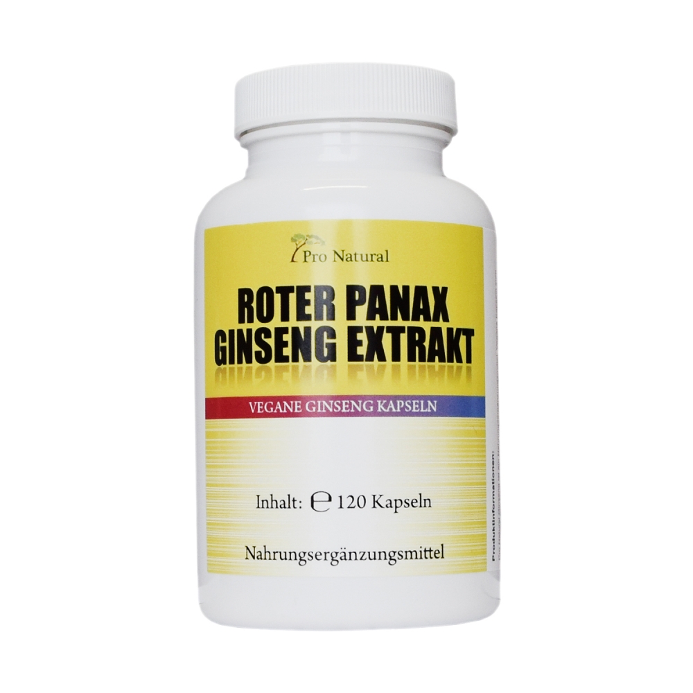 Pro Natural Roter Panax Ginseng Extrakt - Dose á 120 Kapseln. Pro Natural Roter Panax Ginseng Extrakt ist ein in Deutschland hergestelltes Kapselprodukt, welches Sie mit 1200 Milligramm (mg) pro Tagesportion (2 Kapseln) versorgt, welche Ihnen 20% reine Ginsenoide (240 mg) liefern. Bei Pro Natural Roter Panax Ginseng Extrakt handelt es sich um ein Kapselprodukt, dass sich für vegane und vegetarische Anwender eignet. Pro Dose sind 120 Kapseln enthalten, die 60 Tagesportionen á 2 Kapseln entsprechen. Geliefert wird Pro Natural Roter Panax Ginseng Extrakt in einer wiederverschließbaren, lichtundurchlässigen Standdose.