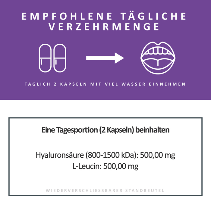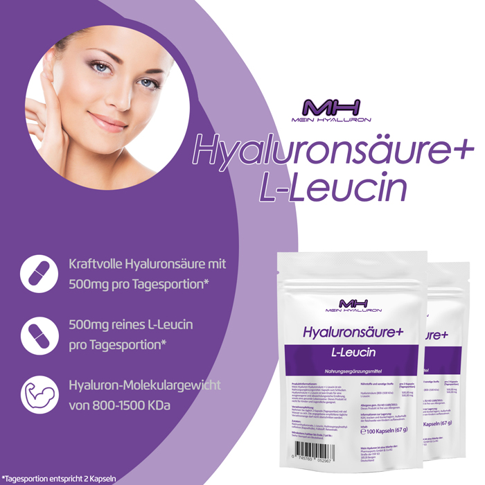 Nehme Hyaluronsäure Kapseln schon seit einigen Jahren ein - vor allem zur Unterstützung meiner Gelenke, aber auch für eine frischere Haut. Und ich meine, dass beides dadurch auch tatsächlich bewirkt wird. Diese Kapseln enthalten neben der allgemein üblichen Dosis von 500 mg Hyaluronsäure auch Leucin. Es ist zusammen mit der Hyaluronsäure den einen oder anderen synergetischen Effekt.