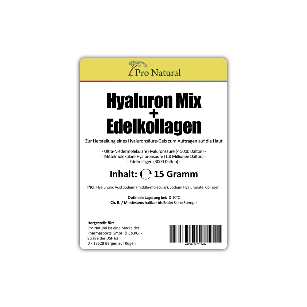 Pro Natural Hyaluron Mix + Edelkollagen - Standbeutel á 15 Gramm. Pro Natural Hyaluron Mix + Edelkollagen ist eine Kosmetika zur Selbstherstellung. Neben Ultra Niedermolöekularer Hyaluronsäure (< 5000 Dalton) und Mittelmolekularer Hyaluronsäure (1,8 Millionen Dalton), findet sich zudem noch wertvolles Edelkollagen (3000 Dalton).