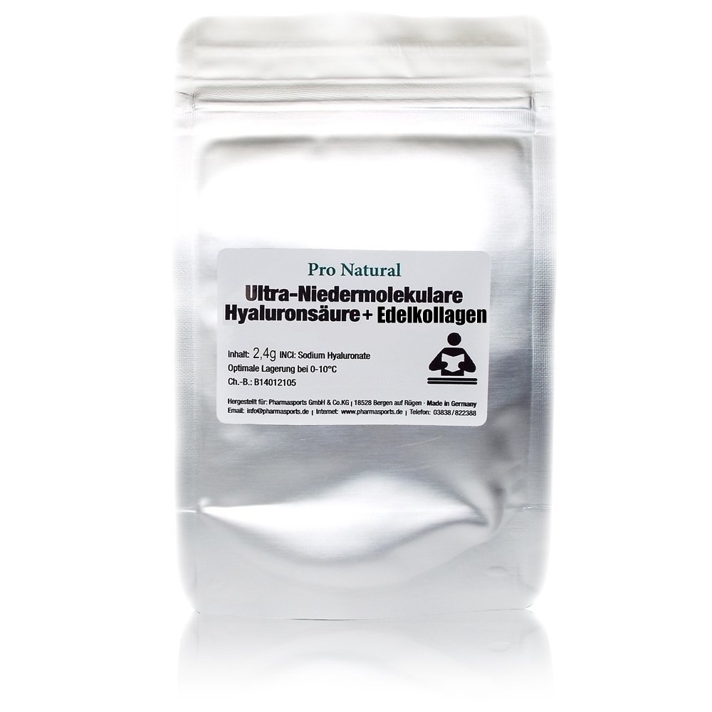 Pro Natural Ultra-Niedermolekulare Hyaluronsäure + Edelkollagen ist eine hochwertige Kosmetika zur Selbstherstellung. Neben Ultra-Niedermolekularen Hyaluronsäure findet sich in diesem Produkt zudem noch Edelkollagen. Die Masse der enthaltenen Nieder-Molekularen Hyaluronsäure liegt unter 5000 Dalton, die des Edelkollagen bei 3000 Dalton. Pro Packung (2,4 Gramm) sind 2 Gramm Ultra-Niedermolekulare Hyaluronsäure, sowie 0,4 Gramm Edelkollagen enthalten.