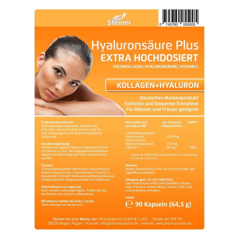 Steiner Hyaluronsäure Plus – Standbeutel á 90 Kapseln. Steiner Hyaluronsäure Plus überzeugt mit der starken und ideal abgestimmten Kombination aus Fischkollgen-Pepide-Hydrolysat, Hyaluronsäure sowie Vitamin C.