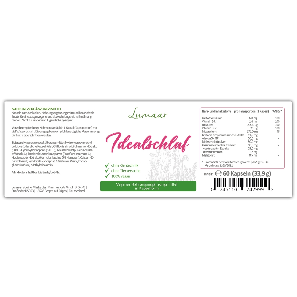 Lumaar Idealschlaf - wiederverschließbarer Braunglasbehälter á 60 Kapseln. Lummar Idealschlaf ist Ihre Quelle für wertvolle Nährstoffe, um Ihre Schlafphase zu unterstützen. Unter anderem finden sich unter den 10 enthaltenen Nährstoffen Melatonin, 5-HTP, Melissenblattpulver oder Hopfenzapfen-Extrakt.