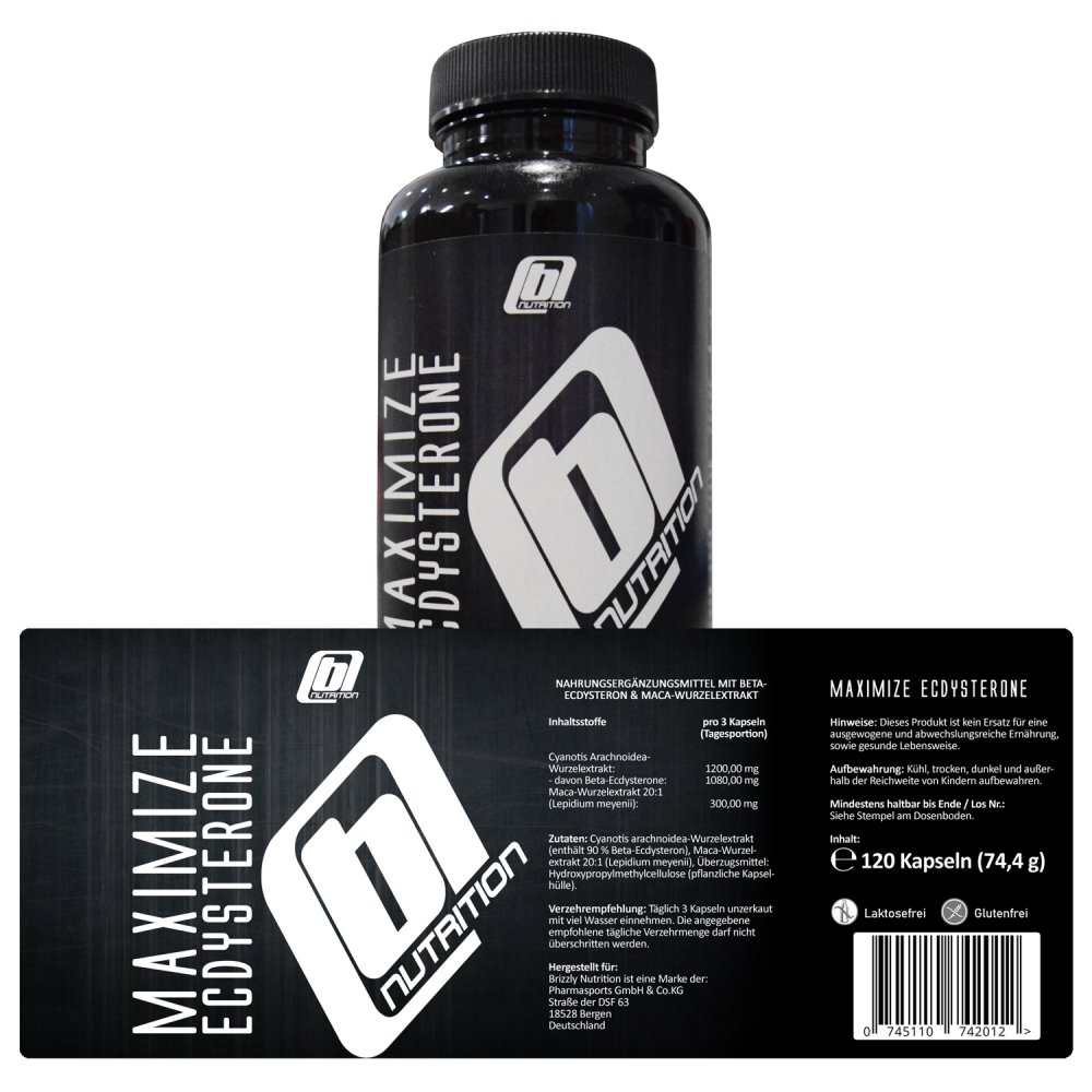 Brizzly Nutrition Maximize Ecdysterone - wiederverschließbare Standdose á 120 Kapseln. Mit Brizzly Nutrition Maximize Ecdysterone erhalten Sie ein stark abgestimmtes Kapselprodukt, welches Sie neben Cyanotis Arachnoidea-Wurzelextrakt noch mit zusätzlichem Maca-Wurzelextrakt (20:1) versorgt. Pro Tagesportion (3 Kapseln) finden sich 1200 Milligramm (mg) Cyanotis Arachnoidea-Wurzelextrakt, wovon 1080 mg reine Beta-Ecdysterone entsprechen. Zusätzlich findet sich pro Tagesportion eine Menge von 300 mg Maca-Wurzelextrakt im 20:1 Verhältnis.