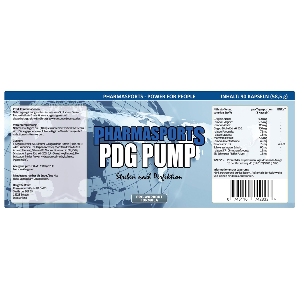 Pharmasports PDG Pump - Standdose á 90 Kapseln. Pharmasports PDG Pump ist ein so genanntes Pre-Workout Supplement, dass vor sportlicher Aktivität eingesetzt wird. Alle enthaltenen Inhaltsstoffe sind zu 100% aufeinandern abgestimmt und können von männlichen wie weiblichen Anwender genutzt werden.