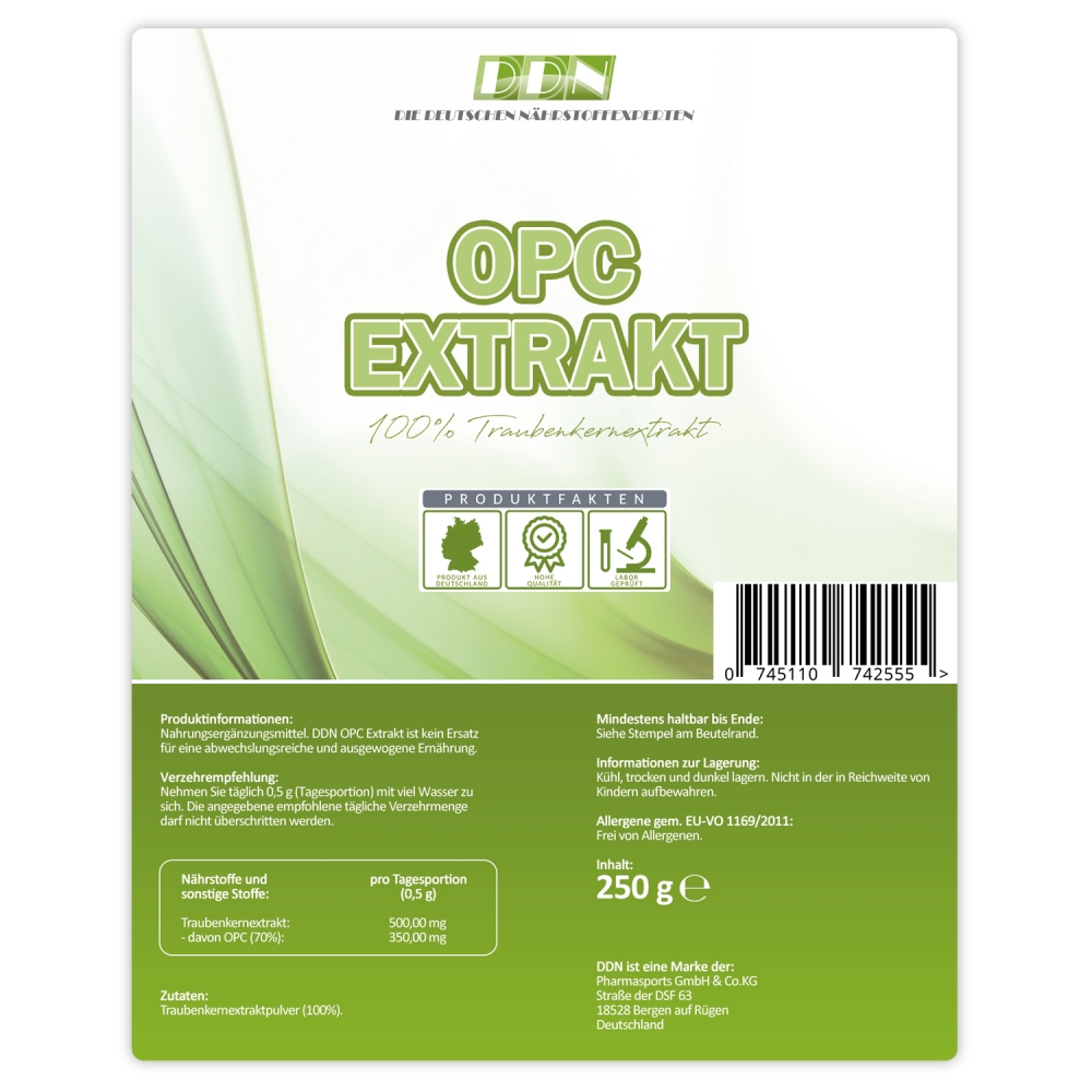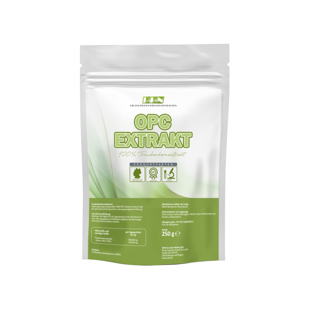 DDN OPC Extrakt - wiederverschließbarer Standbeutel mit einem Inhalt von 250 Gramm. OPC (Oligomeren Proanthocyanidine), besser bekannt als Traubenkernextrakt stellt einen in der Natur vorkommenden Vitalstoff dar. Neben Traubenkernen findet sich OPC zudem in Nüssen oder in Blättern des beliebten grünen Tees.