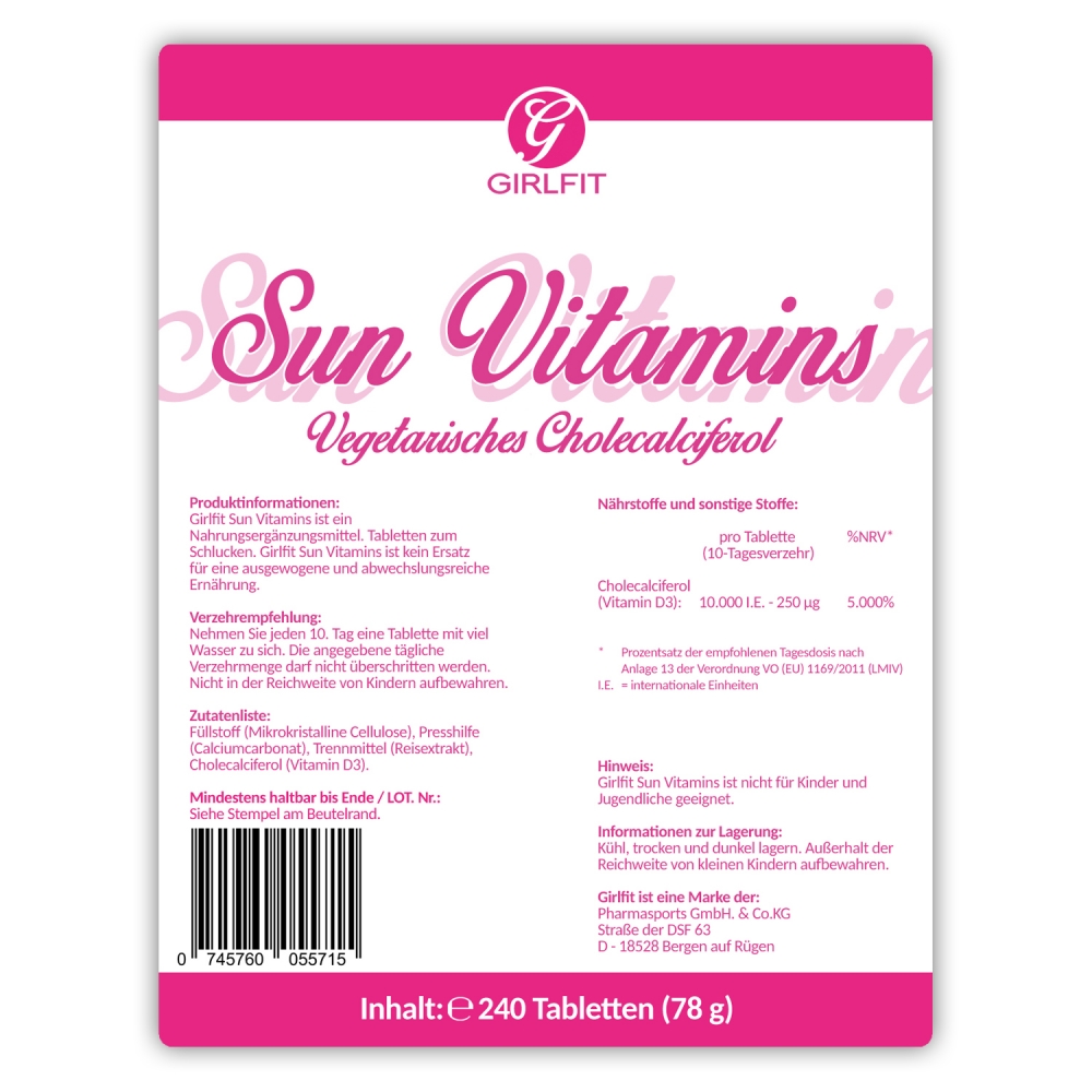 Girlfit Sun Vitamins ist Ihre Quelle für wertvolles Vitamin D3 (Cholecalciferol bzw. Colecalciferol) in der einfachen und bequemen Tablettenform. Geliefert wird Girlfit Sun Vitamins in einem lichtundurchlässigen, wiederverschließbaren Standbeutel mit einem Inhalt von 240 Tabletten.