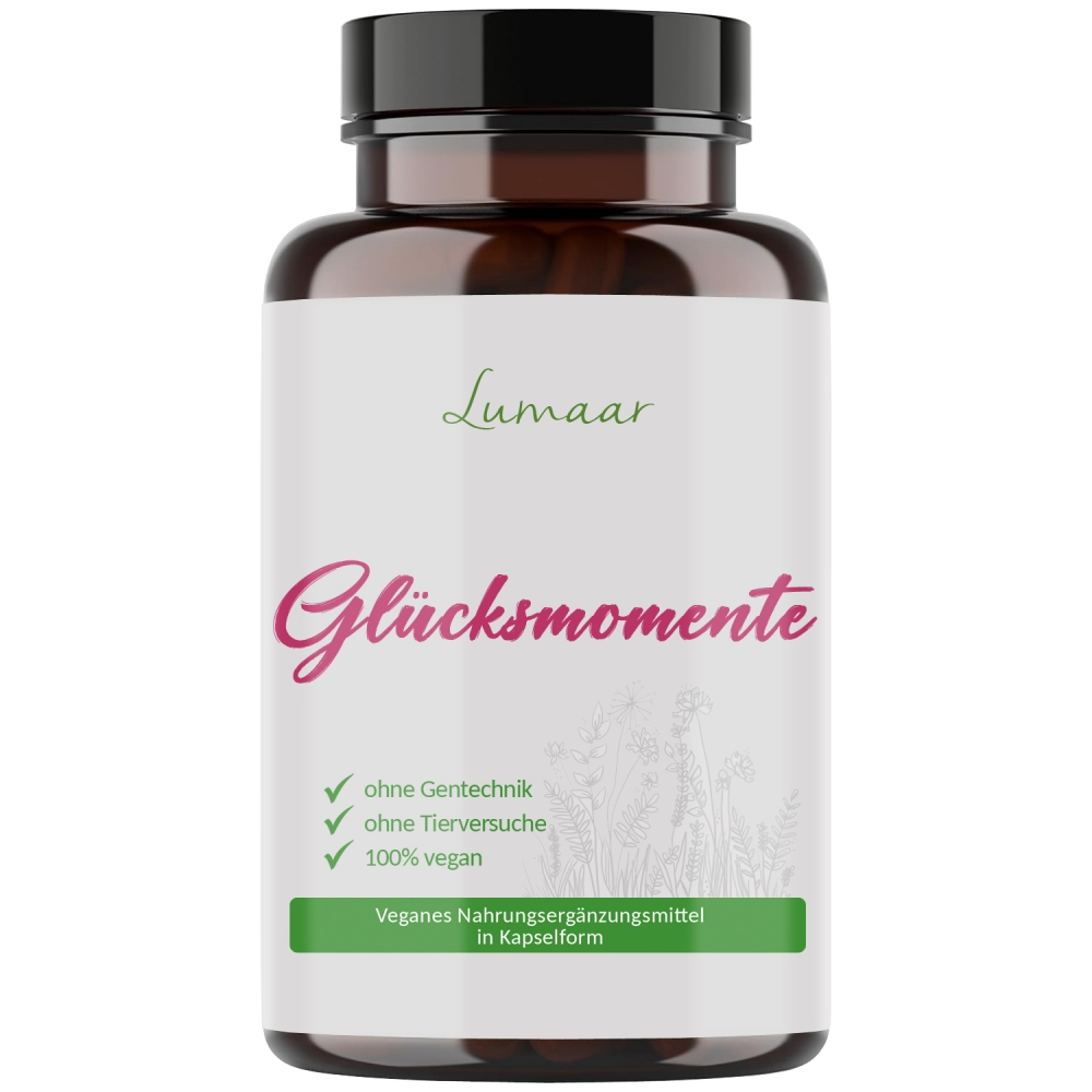 Lumaar Glücksmomente - wiederverschließbarer Braunglasbehälter á 60 Kapseln. Lumaar Glücksmomente stellen ein deutsches Nahrungsergänzungsmittel in Kapselform dar und überzeugen durch eine ganze Reihe an B-Vitaminen, sowie der essentiellen Aminosäure L-Phenylalanin.