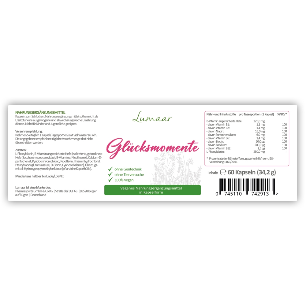 Lumaar Glücksmomente ist Ihre Quelle für wertvolle B-Vitamine, sowie L-Phenylalanin in der bequemen Kapselform. Alle enthaltenen Inhaltsstoffe, sowie die Kapselhülle sind pflanzlicher Herkunft. Somit ist Lumaar Glücksmomente für Anwender geeignet, die einer vegetarischen oder veganen Ernährung folgen.