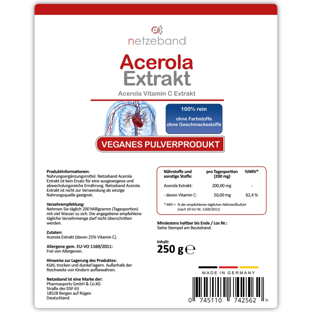 Netzeband Acerola Extrakt - wiederverschließbarer Standbeutel á 250 Gramm. Mit Netzeband Acerola Extrakt erhalten Sie ein in Deutschland gefertigtes Vitamin C Produkt, welches sich ohne Zusätze wie Farb- oder Geschmacksstoffe in 100% natürlicher Form (aus der Acerola Kirsche) beweist.