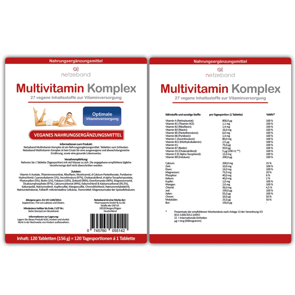 Netzeband Multivitamin Komplex - Standbeutel á 120 Tabletten. Netzeband Multivitamin Komplex stellt ein in Deutschland hergestelltes, veganes Markenprodukt dar, welches Sie 27 verschiedenen Inhaltsstoffen in der einfachen und bequemen Tablettenform unterstützt. Neben verschiedenen Vitaminen findet sich in Netzeband Multivitamin Komplex zudem ein breites Spektrum an verschiedenen Spurenelementen und Mineralien. Netzeband Multivitamin Komplex kann von männlichen, wie auch weiblichen Anwendern genutzt werden.