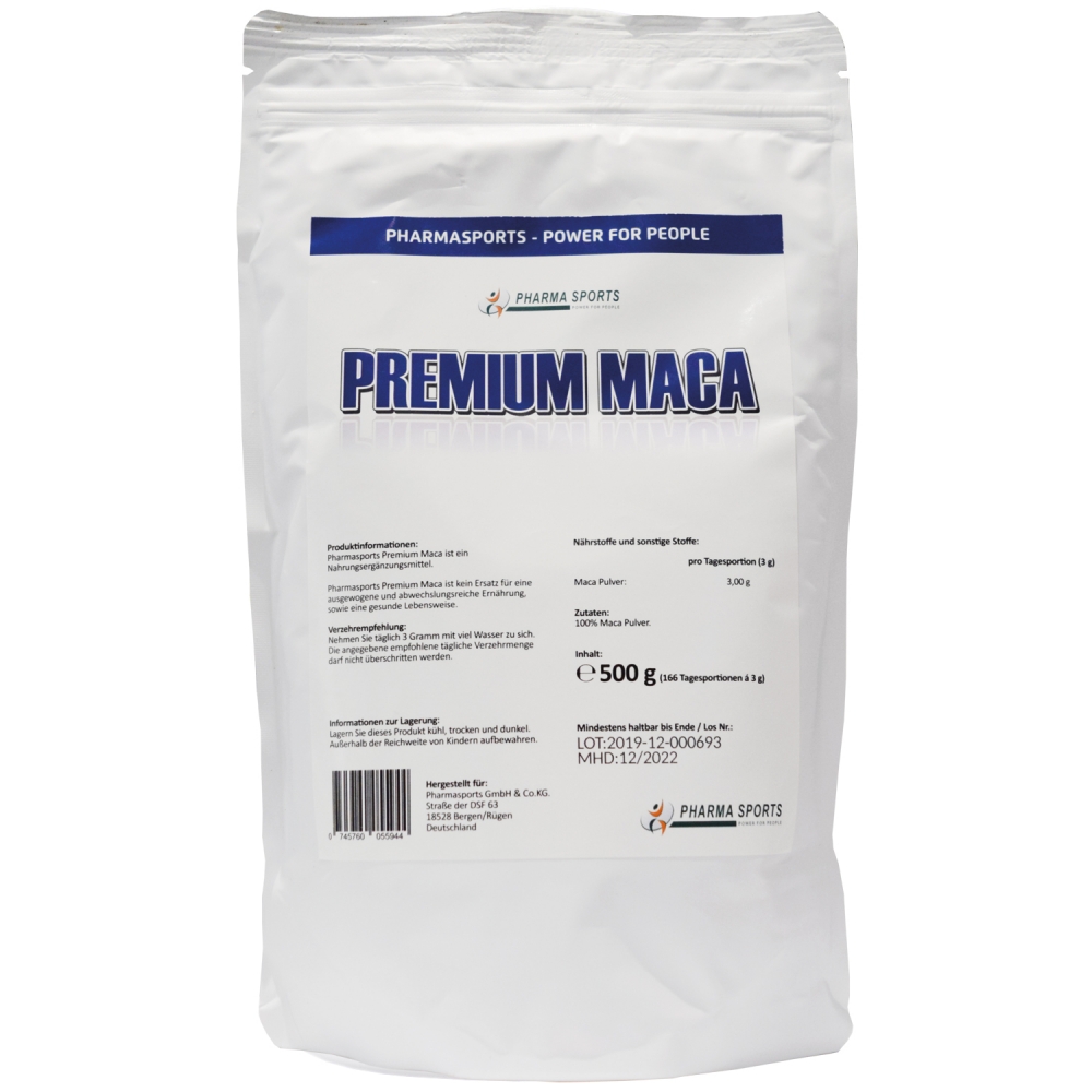 Pharmasports Premium Maca - Standbeutel á 500 Gramm. Pharmasports Premium Maca versorgt Sie mit hochwertigem Maca Pulver, ganz ohne Zusätze wie Farb- oder Geschmacksstoffe. Geliefert wird Pharmasports Premium Maca in einer wiederverschließbaren Standbeutel mit einem Inhalt von 500 Gramm. Diese entsprechen rund 166 Einzelportionen á 3 Gramm.