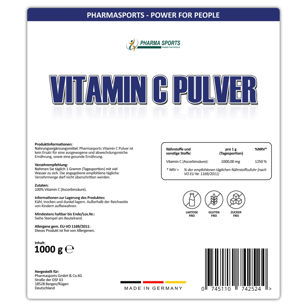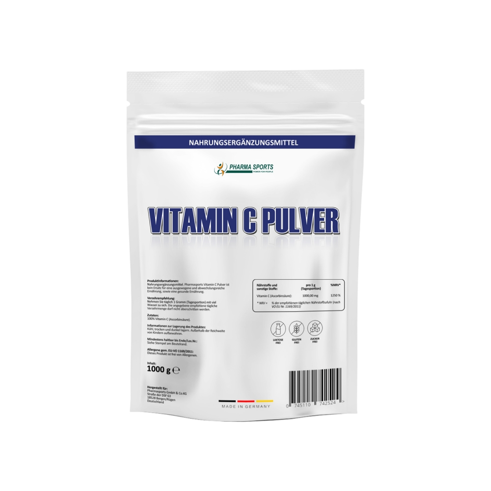 Pharmasports Vitamin C Pulver - wiederverschließbarer Standbeutel á 1000 Gramm. Mit Pharmasports Vitamin C Pulver erhalten Sie ein in Deutschland gefertigtes Vitamin C Produkt, welches sich ohne Zusätze wie Farb- oder Geschmacksstoffe beweist.