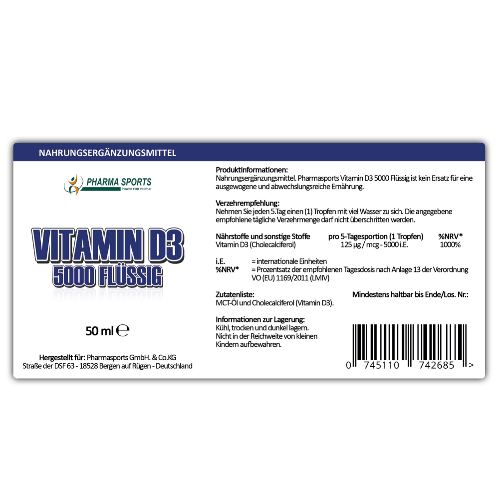 Pharmasports Vitamin D3 5000 Flüssig ist Ihre Quelle für wertvolles Vitamin D3 (Cholecalciferol), welches aus Flechten gewonnen wird, in der einfachen und bequemen Tropfenform. Mittels einer Pipette kann das Produkt möglichst genau dosiert werden. Geliefert wird Pharmasports Vitamin D3 5000 Flüssig in einer wiederverschließbaren Glasflasche mit einem Inhalt von 50 ml (Milliliter), welcher 1850 Tropfen entspricht.